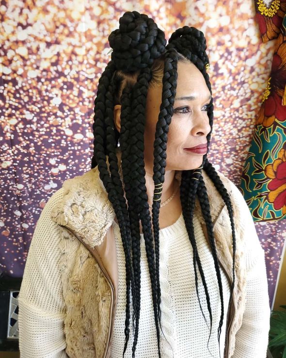 - Box Braids Space Buns: Rock a fun and playful look with box braids space buns. Create two high buns on top of your head for an adorable and energetic vibe.
