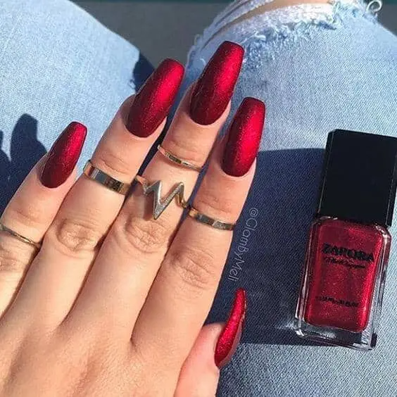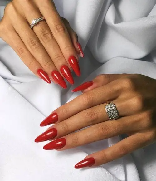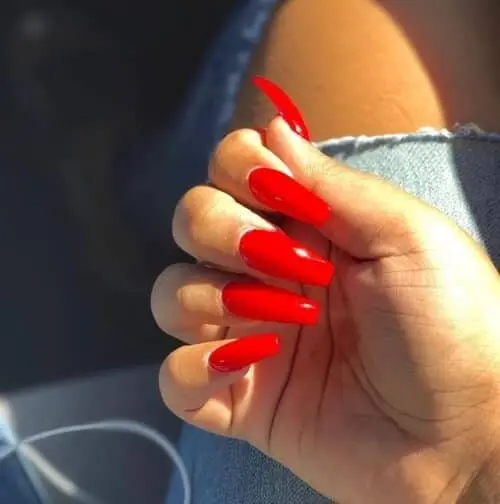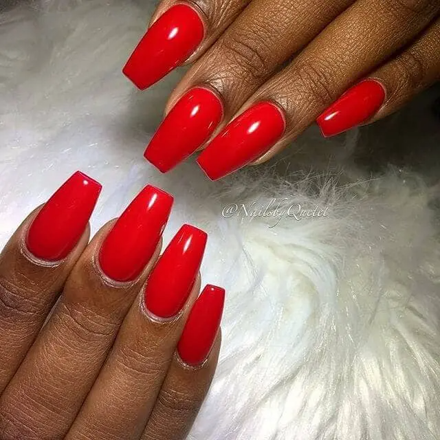 The second question is “How long?” A short red manicure lets you go to that Saturday picnic without worrying about how you’re going to function with the frisbee. A long stiletto manicure is perfect for your front row tickets to the concert of the year. A coffin style nail is trendy, but solid red helps it transition from day to night.