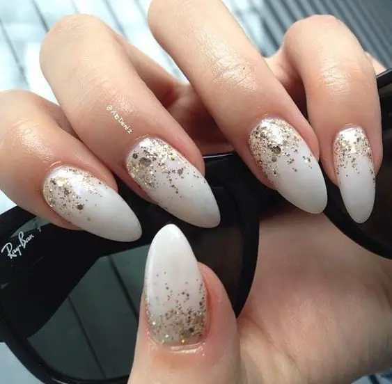 If you find an all-white nail set a bit too intimidating and eye-catching for you, you can always make use of negative space to tone down the vibrant color. The natural color of your nails with the addition of gold flecks as your accent nails will make your manicure a little bit subtle.