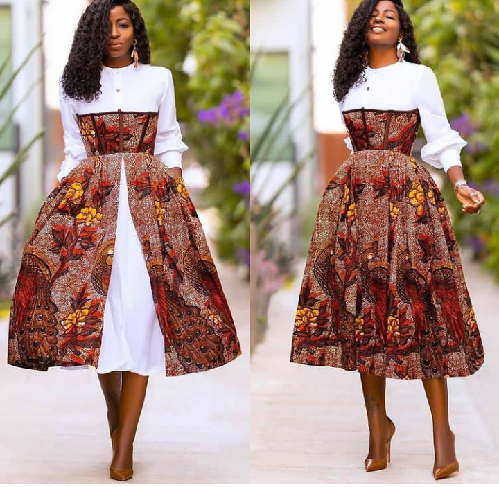 Opt for a peacock Ankara skirt and pair it with a solid-colored blouse to balance the vibrant patterns. You can choose a pencil skirt for a sophisticated look or go for a flared or pleated skirt for a playful and feminine vibe. Complete the outfit with heels or sandals and let the skirt be the focal point of your ensemble.