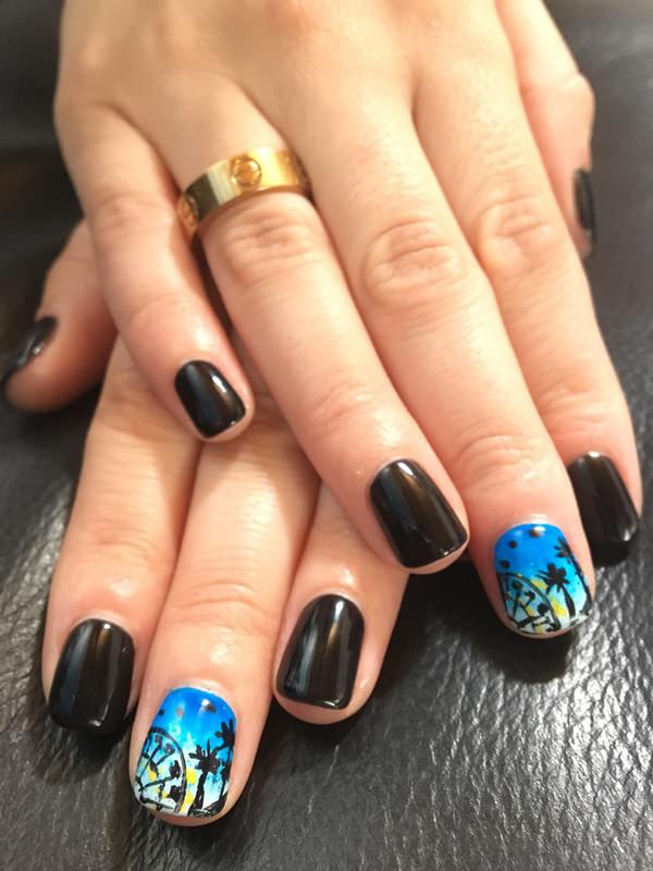 The great thing about the black nail design is that there is one nail that has some design art to it. I love the colors and the Ferris wheel. It’s like a little piece of art on a couple of fo fingers and the colors are just so inspiring. If you want a great summer look, then you will love this one. Blues and yellows always look wonderful together.