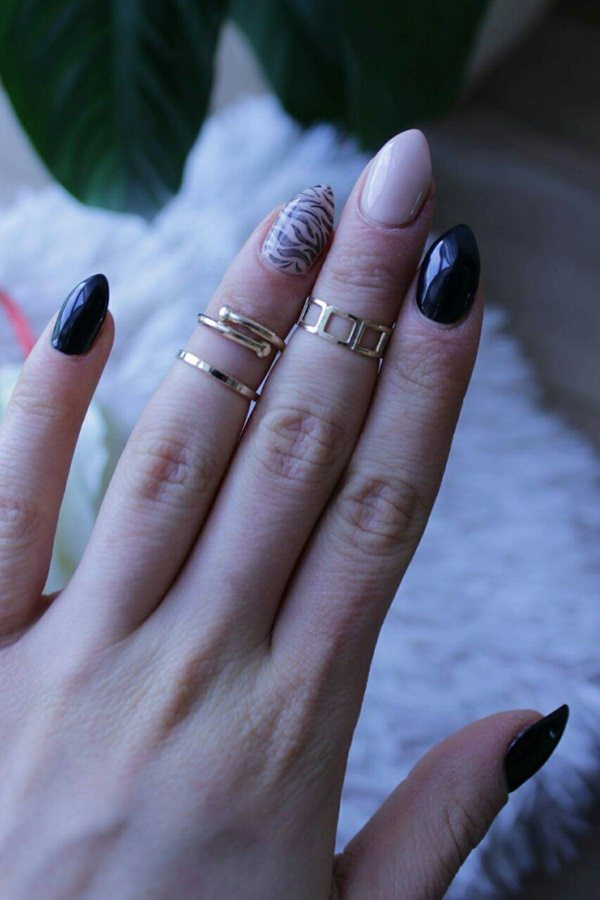 These are fun designs that have black and neutral nails and also a fun zebra one as well. The small nails are pointy and give an elegant style. The designs are special and classy. If you want a great look for brunch with the ladies or a day at the office, then this is the look for you.