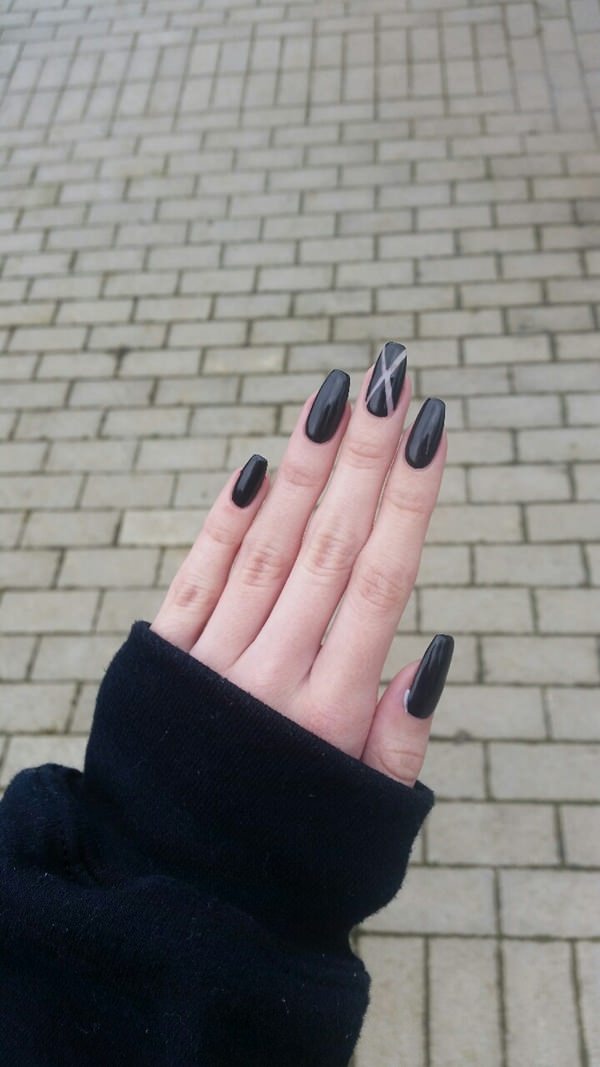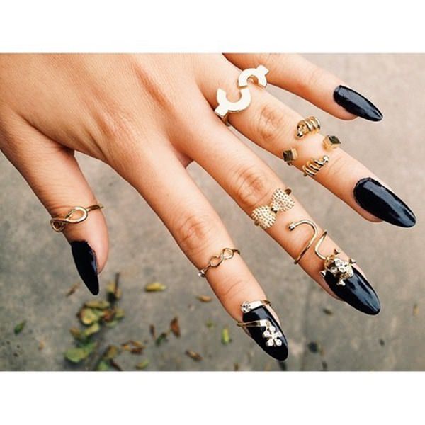 A set of sharp nails that looks amazing with a solid black. If you are into the new nail styles where they ar e a little pointy then you are sure to love this one.
