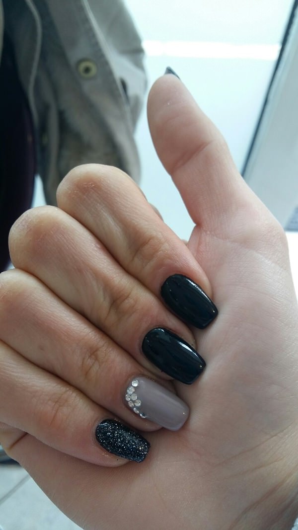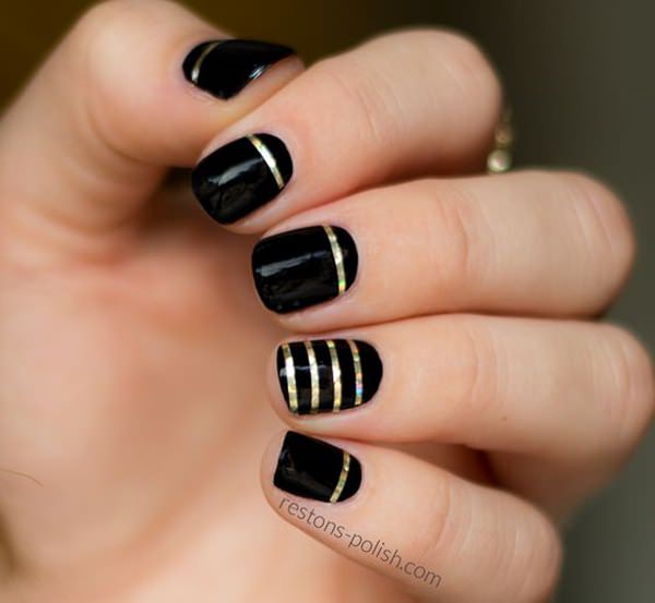 Shiny black nails that look great with a couple of neutrals. The black has a gold stripe that makes it stand out while the neutral tones keep it classy. This would be a great look for the office, a place where sophistication and elegance are key.