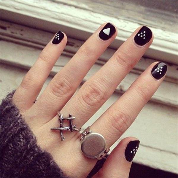 Small black nails with some triangle shapes on them. It’s a fun look that you are sure to love. Some are dotted while others are solid, it’s a great overall design.