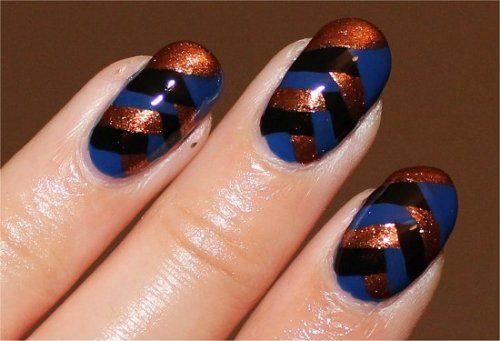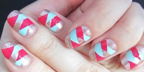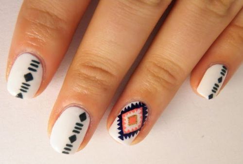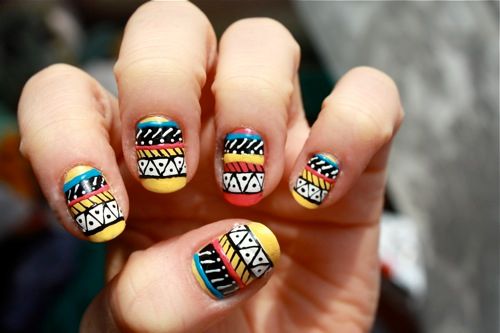 Tribal manis will make you fall head over heels with their eye-catching, any-color-goes palette and a mix of wild patterns. Some geometric inspiration and bright nail paints can help you get show stopping tribal nails and a trendy look.