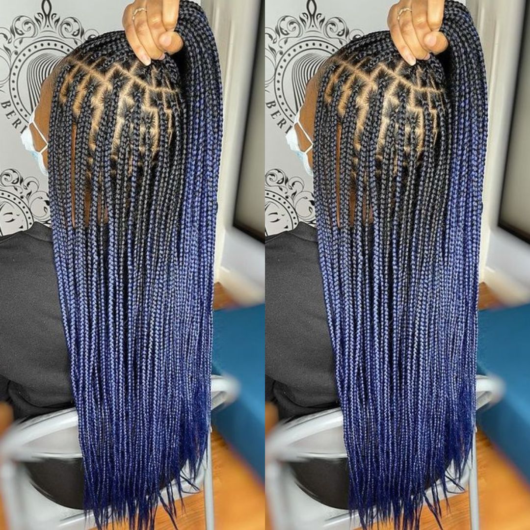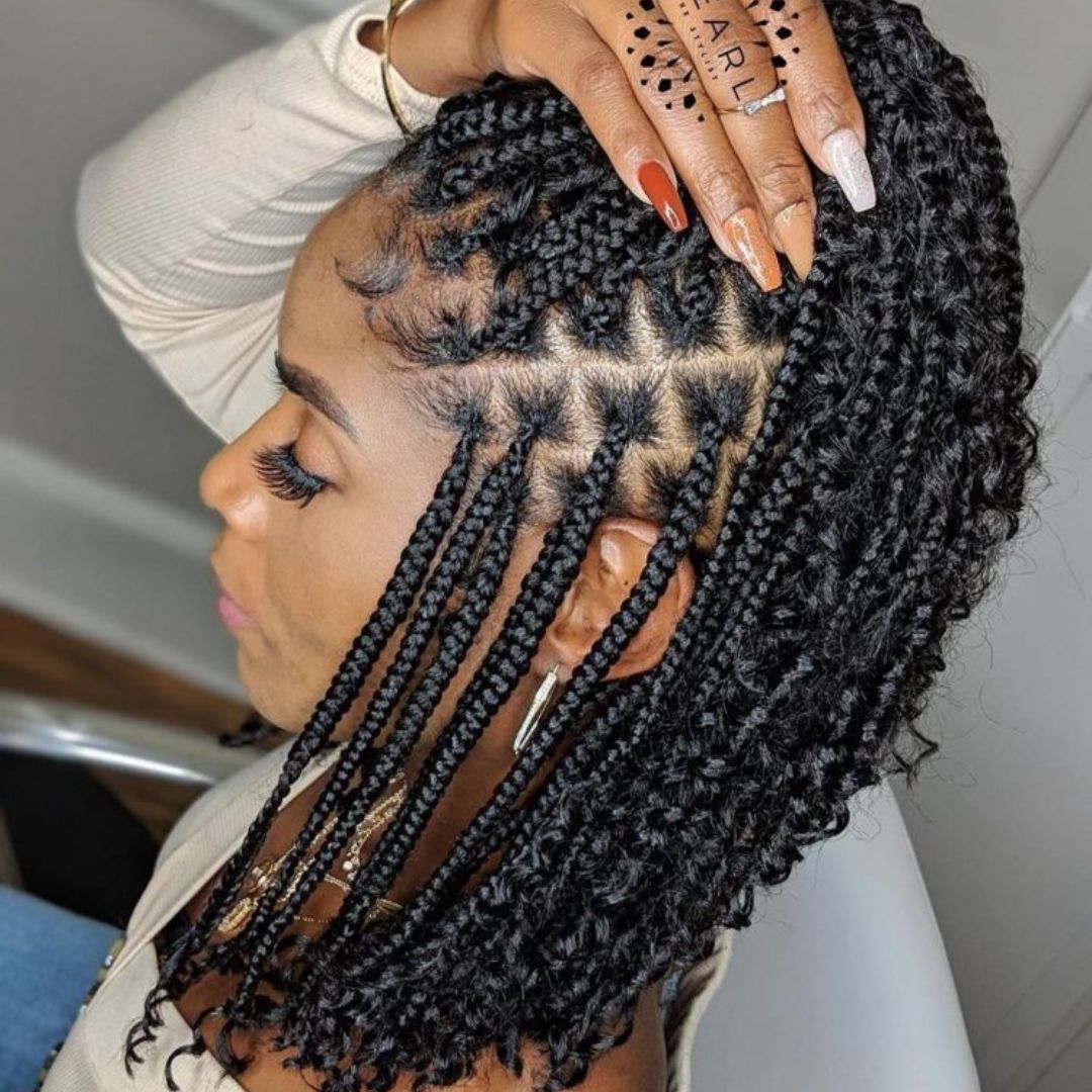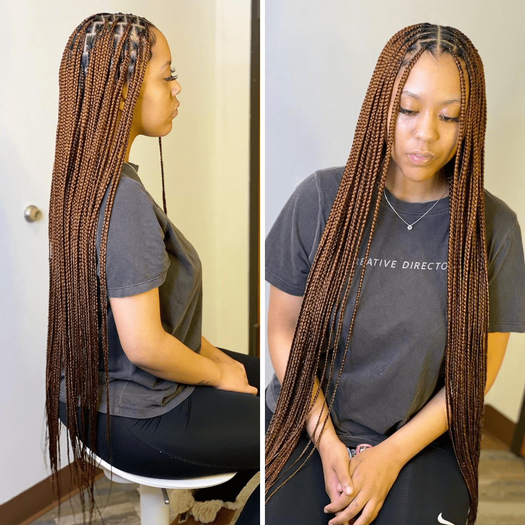 This newer technique eliminates the small knot typically seen at the base of traditional box braids, offering a more seamless look.