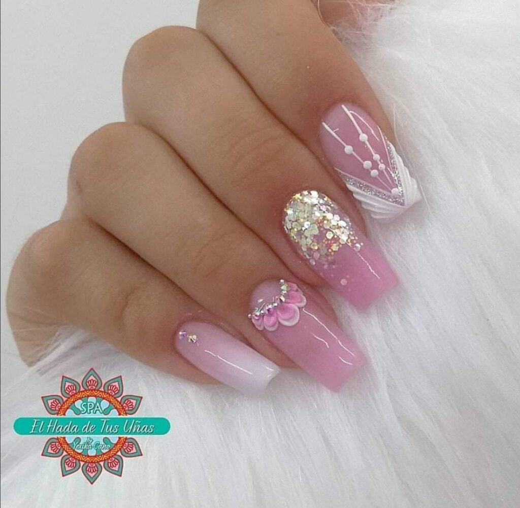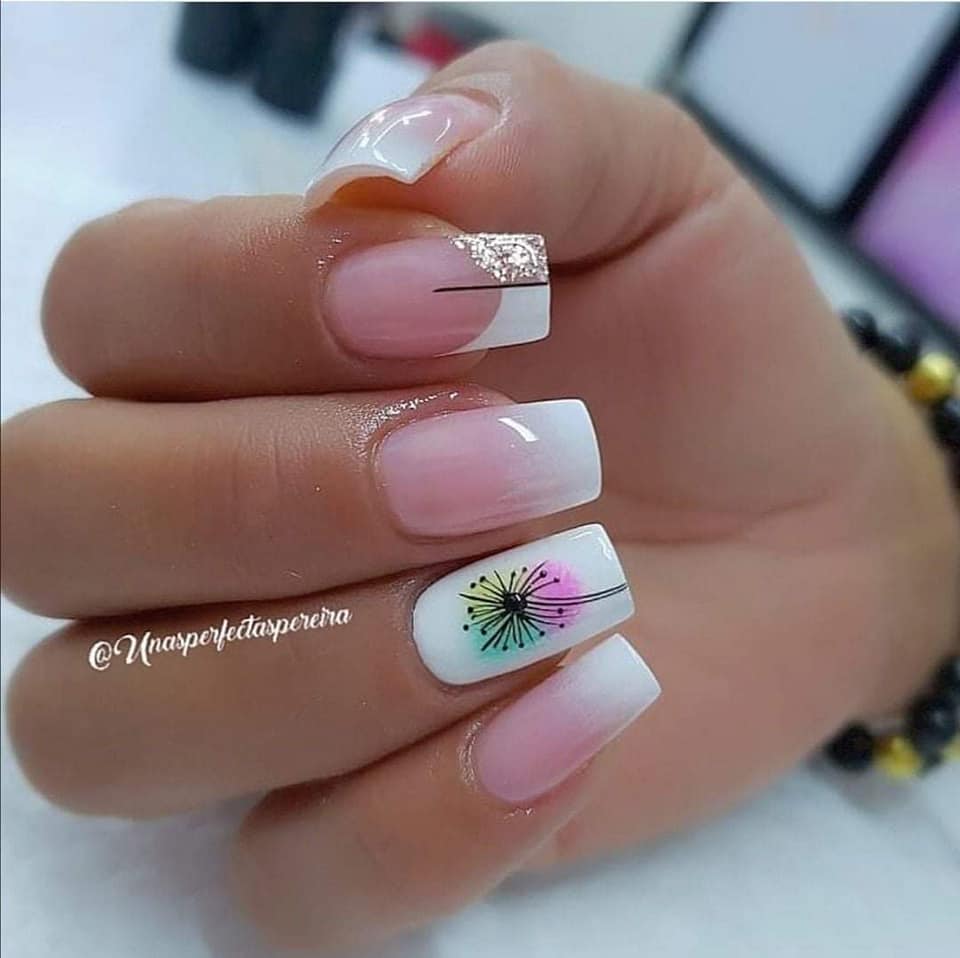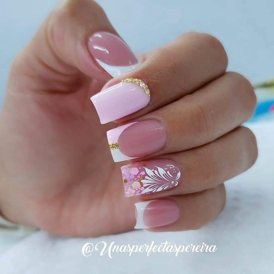 4. Floral Accents: Add a feminine and romantic flair to your square tip manicure with delicate floral accents. Choose a soft, pastel base color and paint intricate flowers or leaves on one or two accent nails. You can also opt for floral nail decals or stickers for a quicker and easier application. Floral designs are versatile and can range from dainty and subtle to bold and eye-catching, allowing you to showcase your personal style.