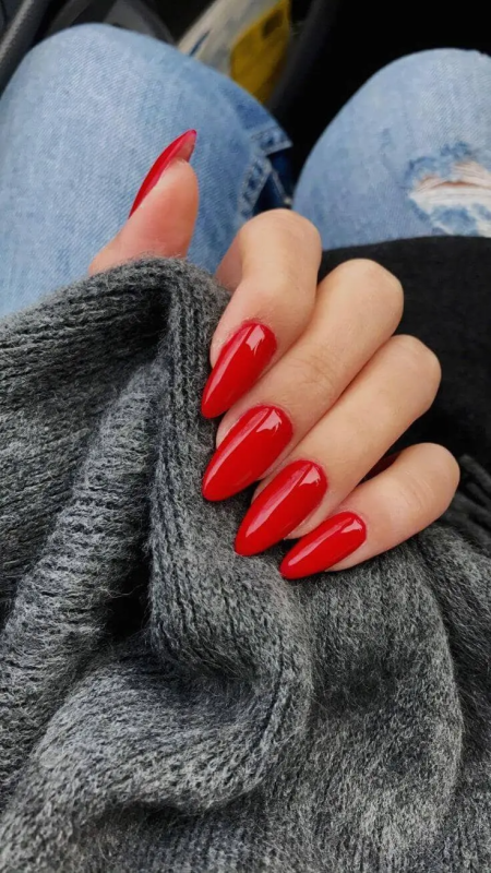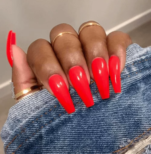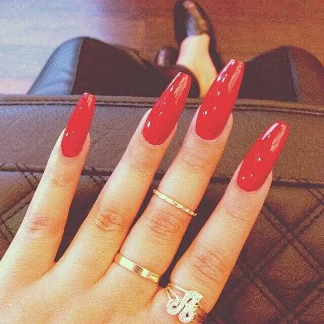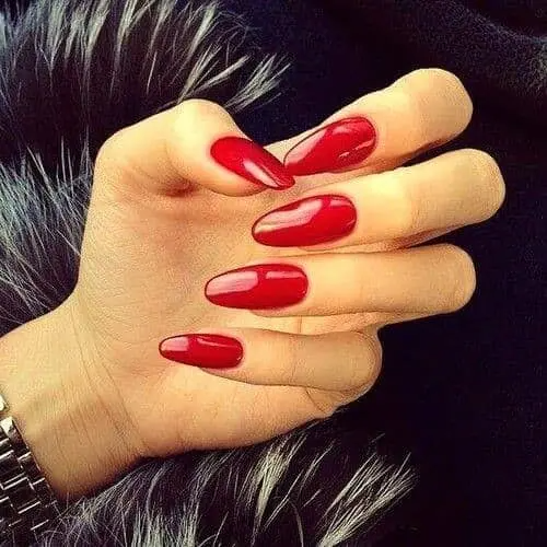 The second question is “How long?” A short red manicure lets you go to that Saturday picnic without worrying about how you’re going to function with the frisbee. A long stiletto manicure is perfect for your front row tickets to the concert of the year. A coffin style nail is trendy, but solid red helps it transition from day to night.