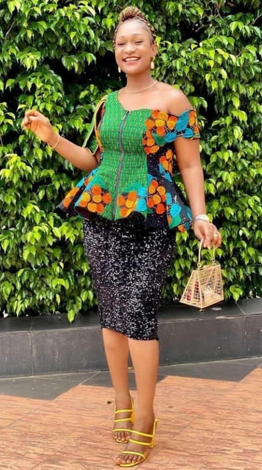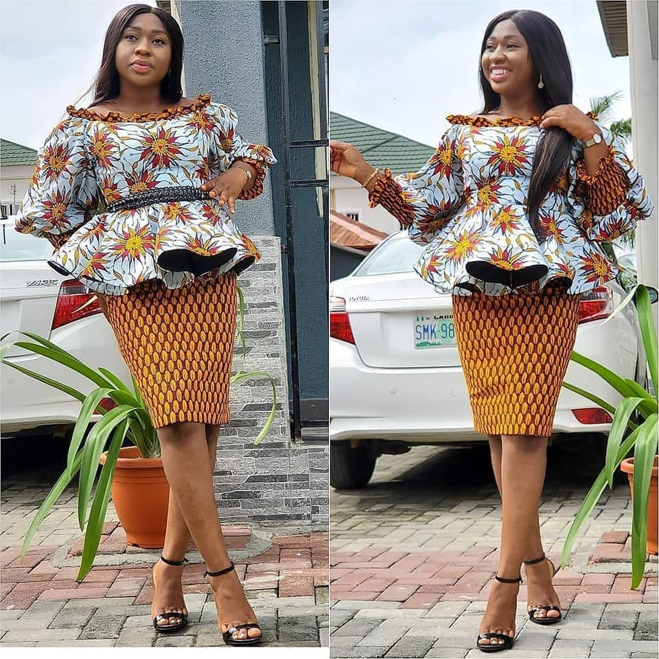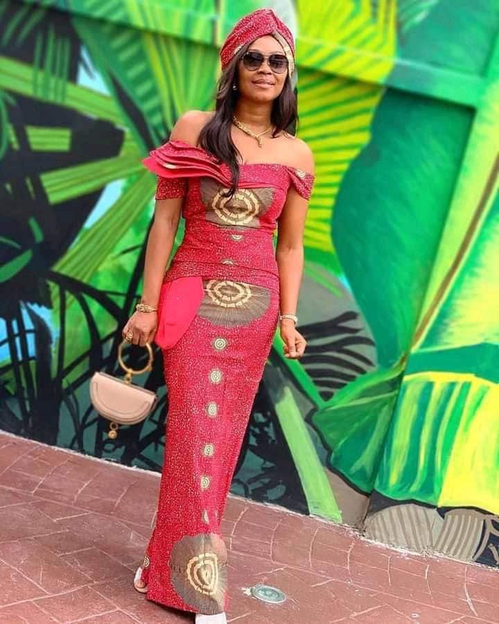 An off-shoulder Ankara dress combines the trendy off-shoulder neckline with the vibrant Ankara prints, creating a chic and fashionable ensemble.