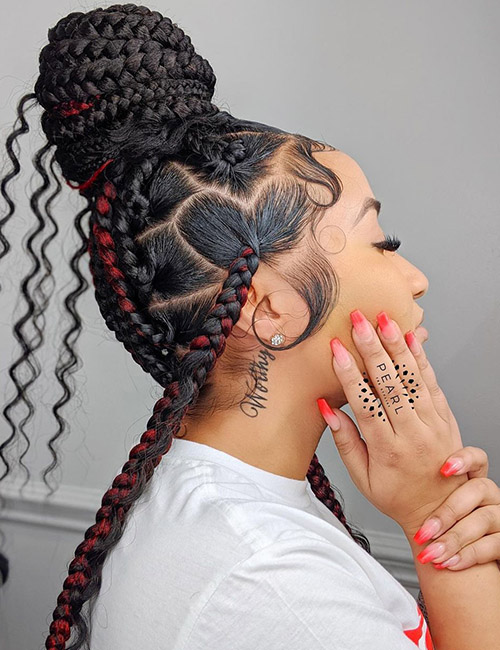 6. Half-Up Half-Down Knotless Braids: Combine the elegance of a half-up half-down hairstyle with the versatility of knotless braids. Pull the upper section into a bun or ponytail while leaving the lower section of braids flowing freely.