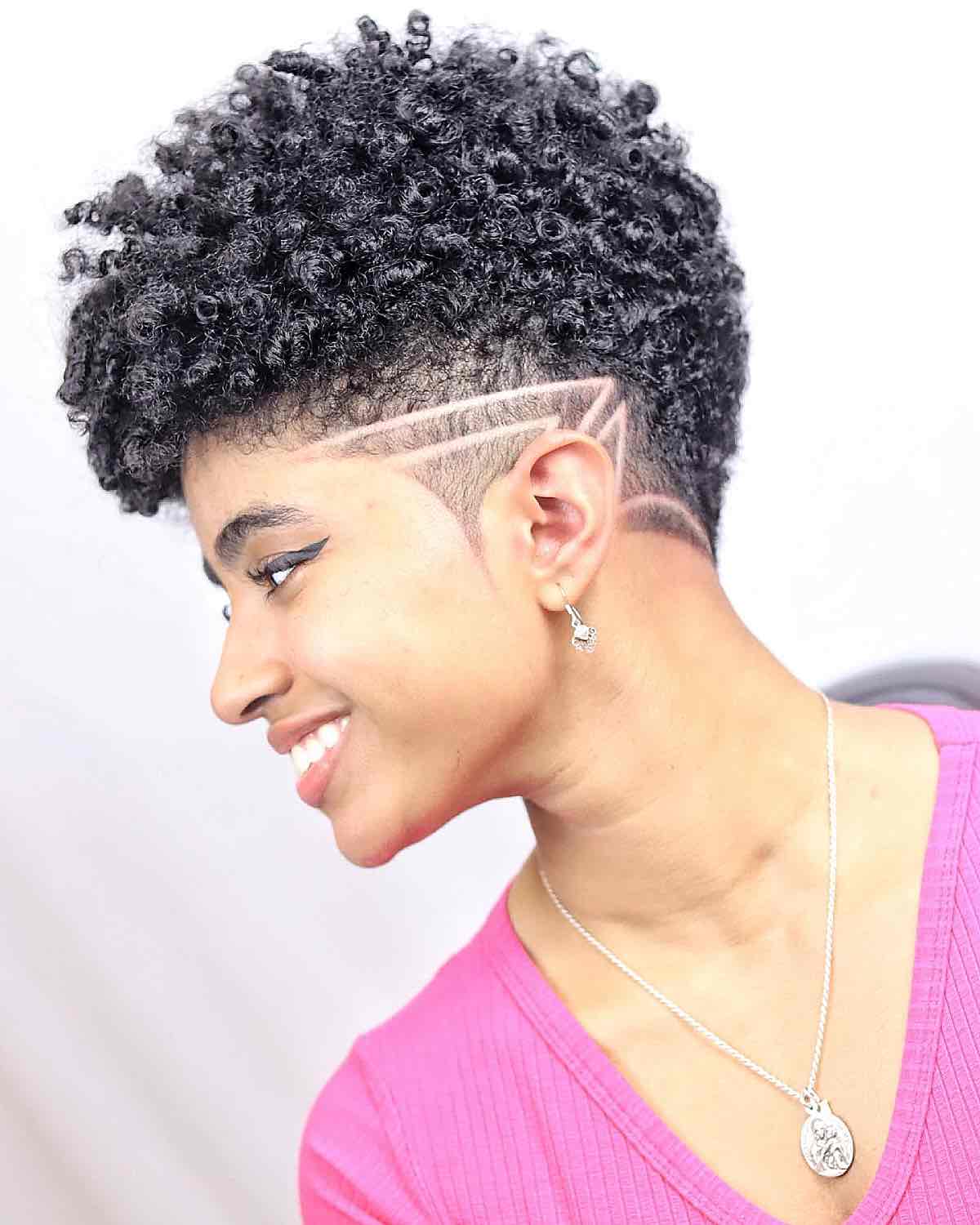 38. Curly Mohawk with Design: Make a bold statement with a curly mohawk featuring creative designs that showcase your personality.
