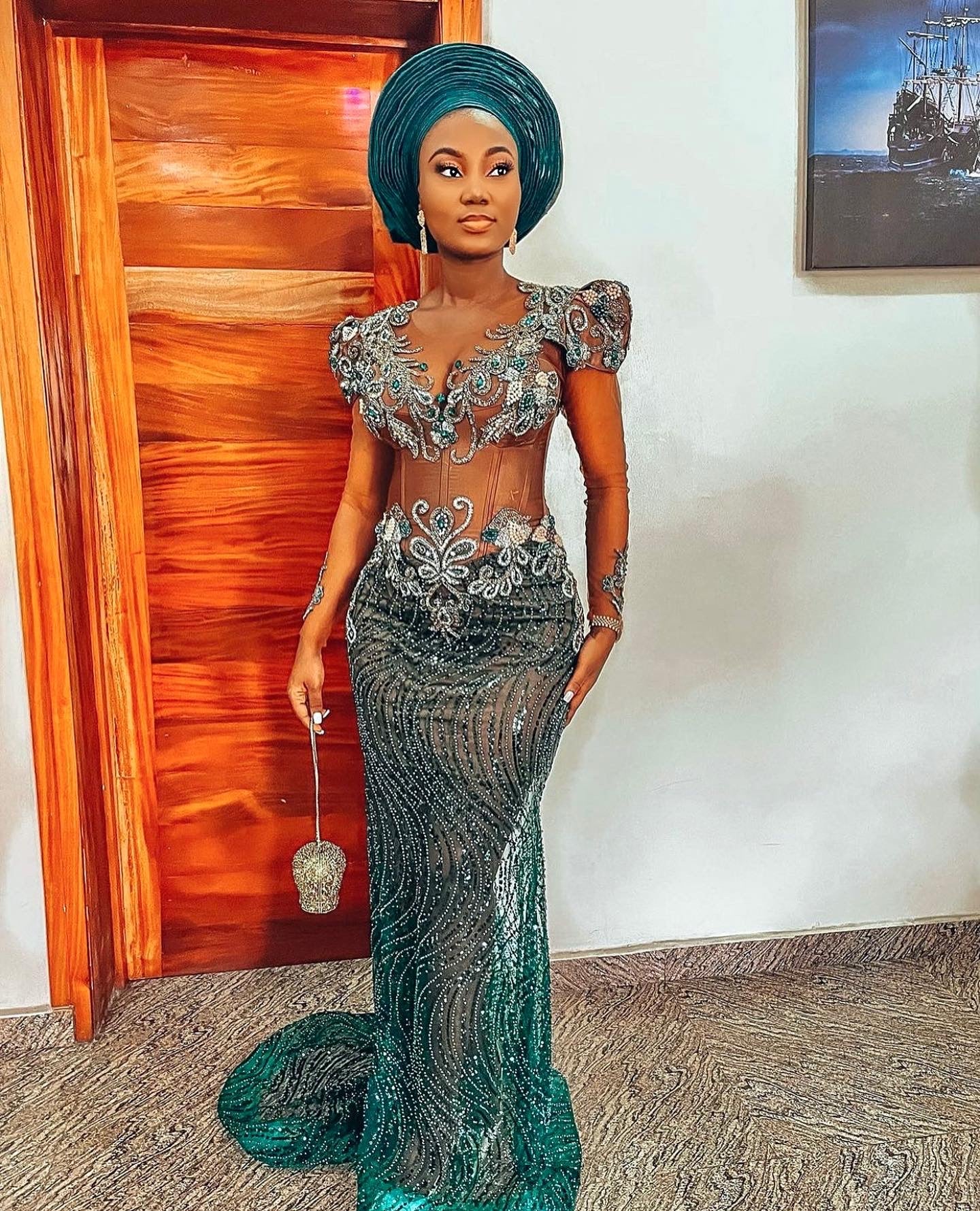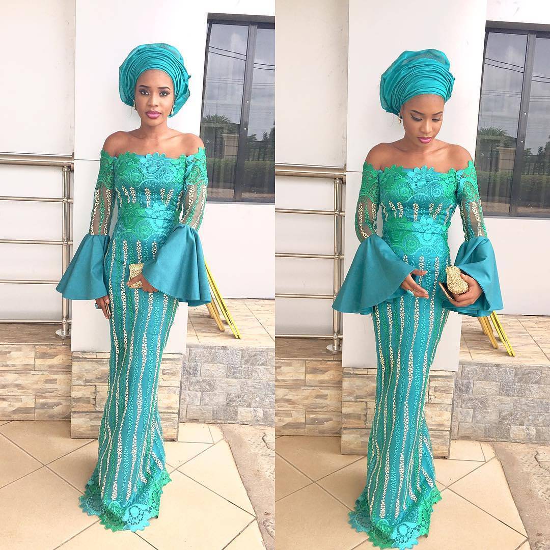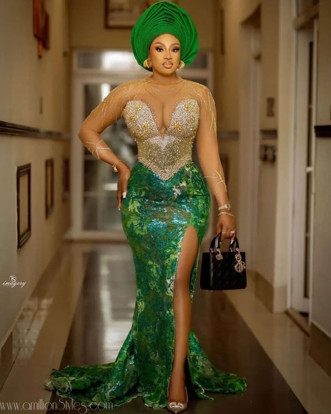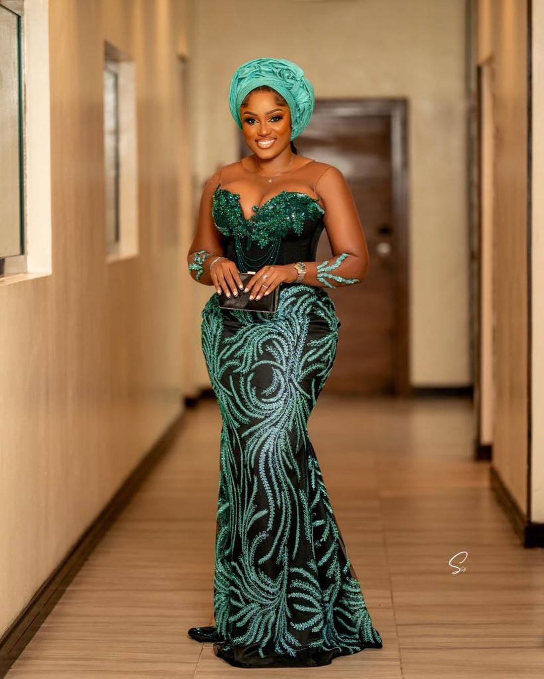 4. Mint Majesty: Embrace the freshness of mint green in your asoebi style. Opt for a delicately pleated dress, an off-the-shoulder ensemble, or a mermaid gown in this serene hue. Accessorize with dainty jewelry and a chic clutch to complete the look.