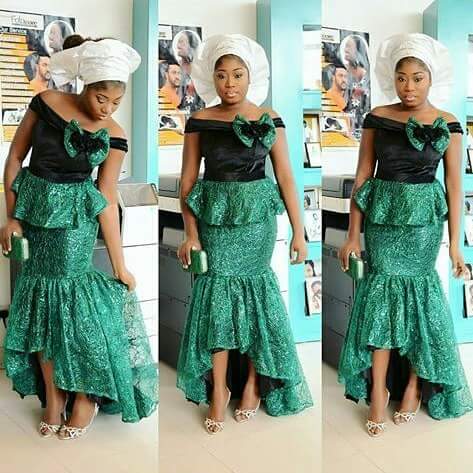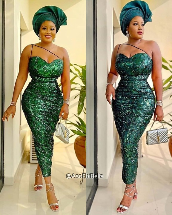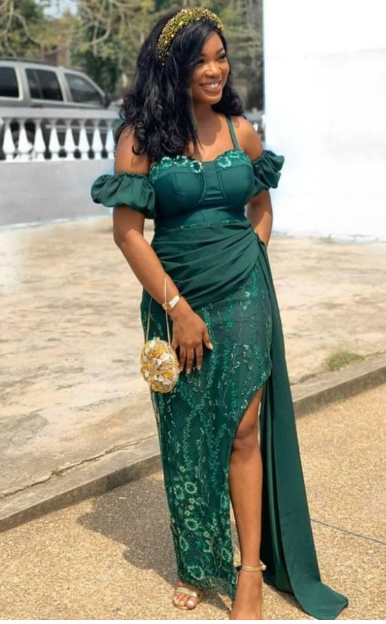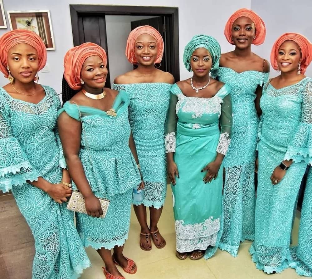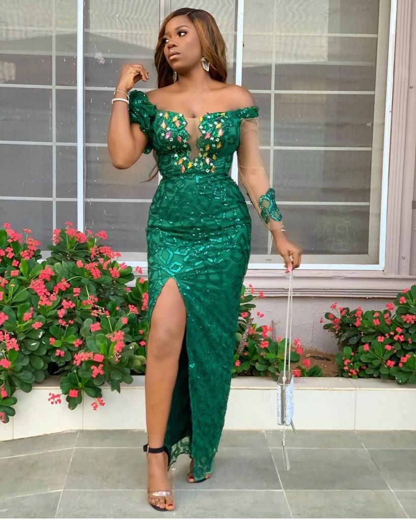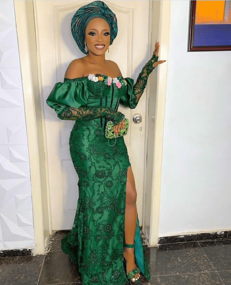 4. Mint Majesty: Embrace the freshness of mint green in your asoebi style. Opt for a delicately pleated dress, an off-the-shoulder ensemble, or a mermaid gown in this serene hue. Accessorize with dainty jewelry and a chic clutch to complete the look.