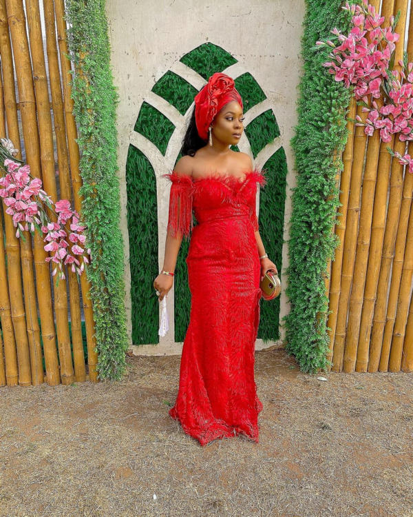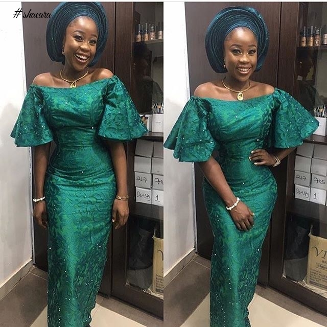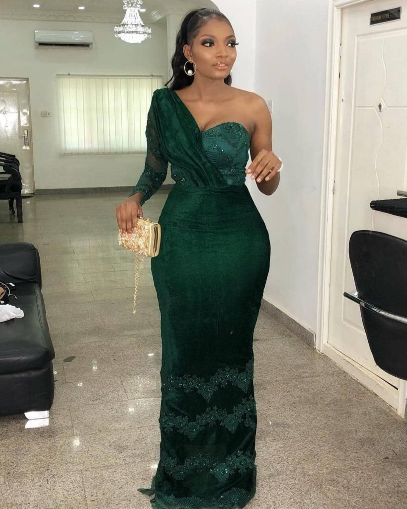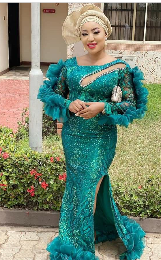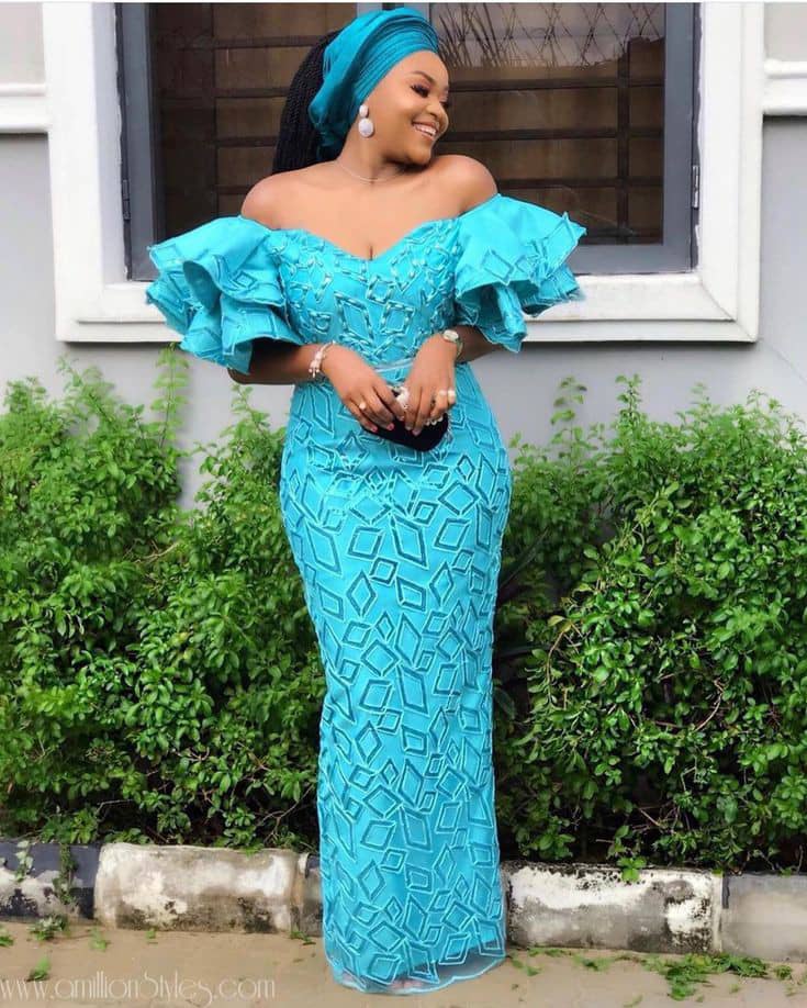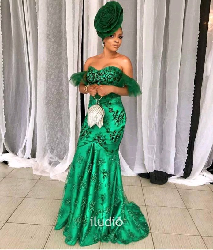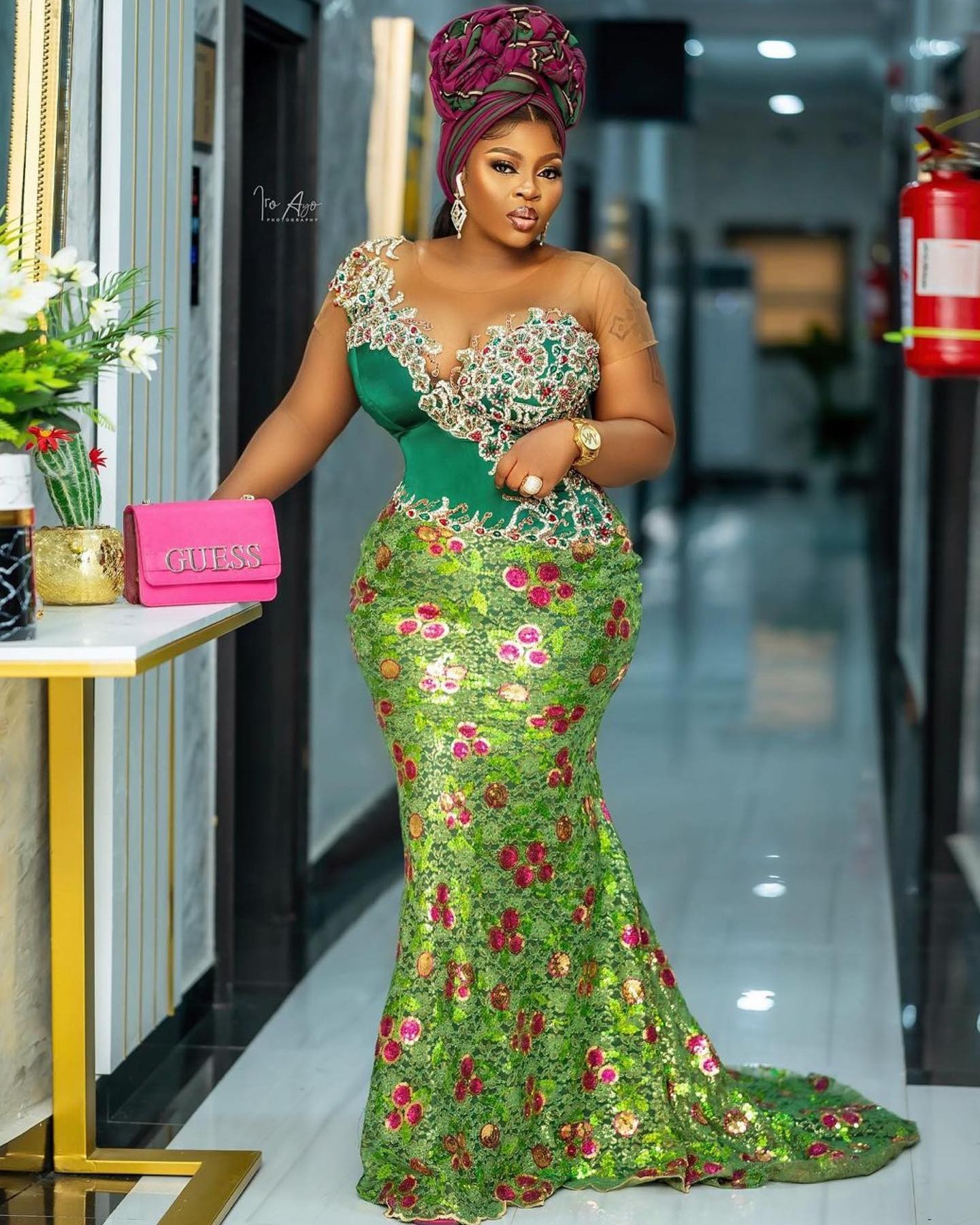 4. Mint Majesty: Embrace the freshness of mint green in your asoebi style. Opt for a delicately pleated dress, an off-the-shoulder ensemble, or a mermaid gown in this serene hue. Accessorize with dainty jewelry and a chic clutch to complete the look.