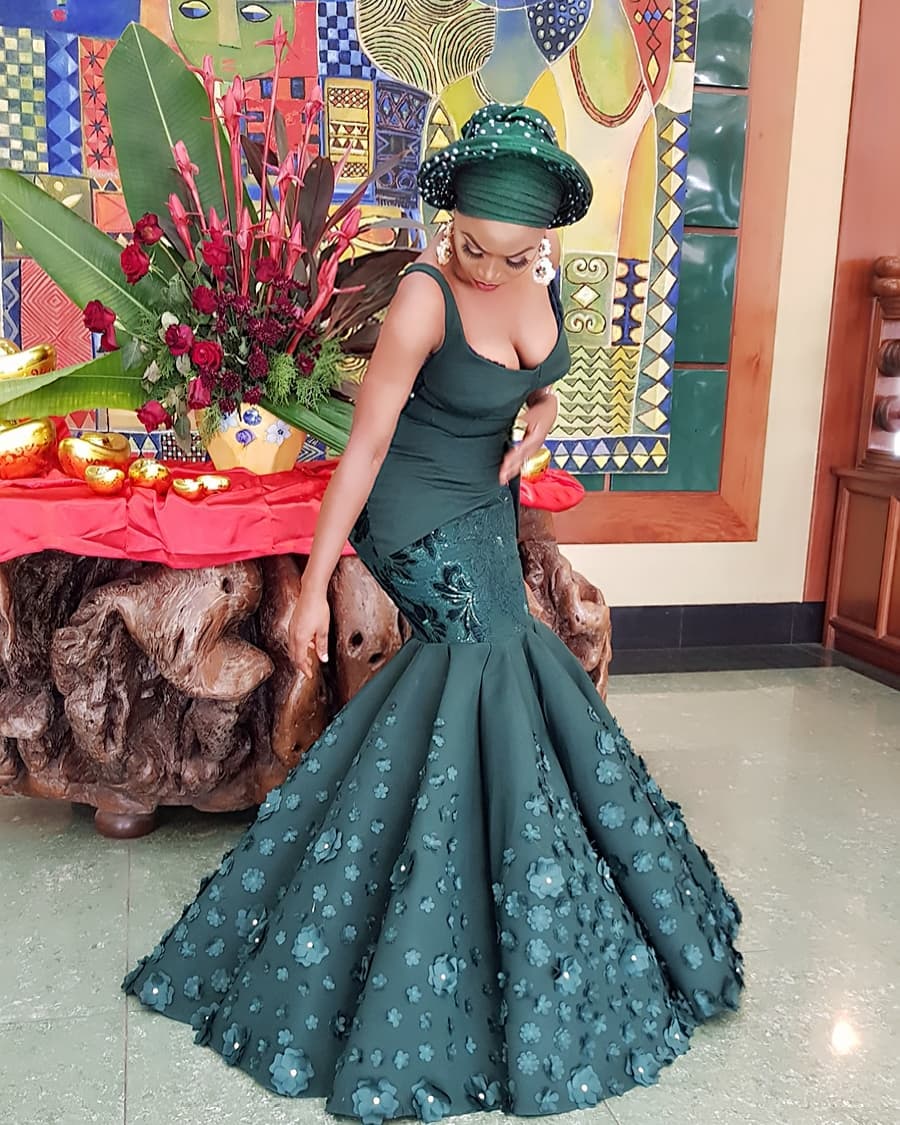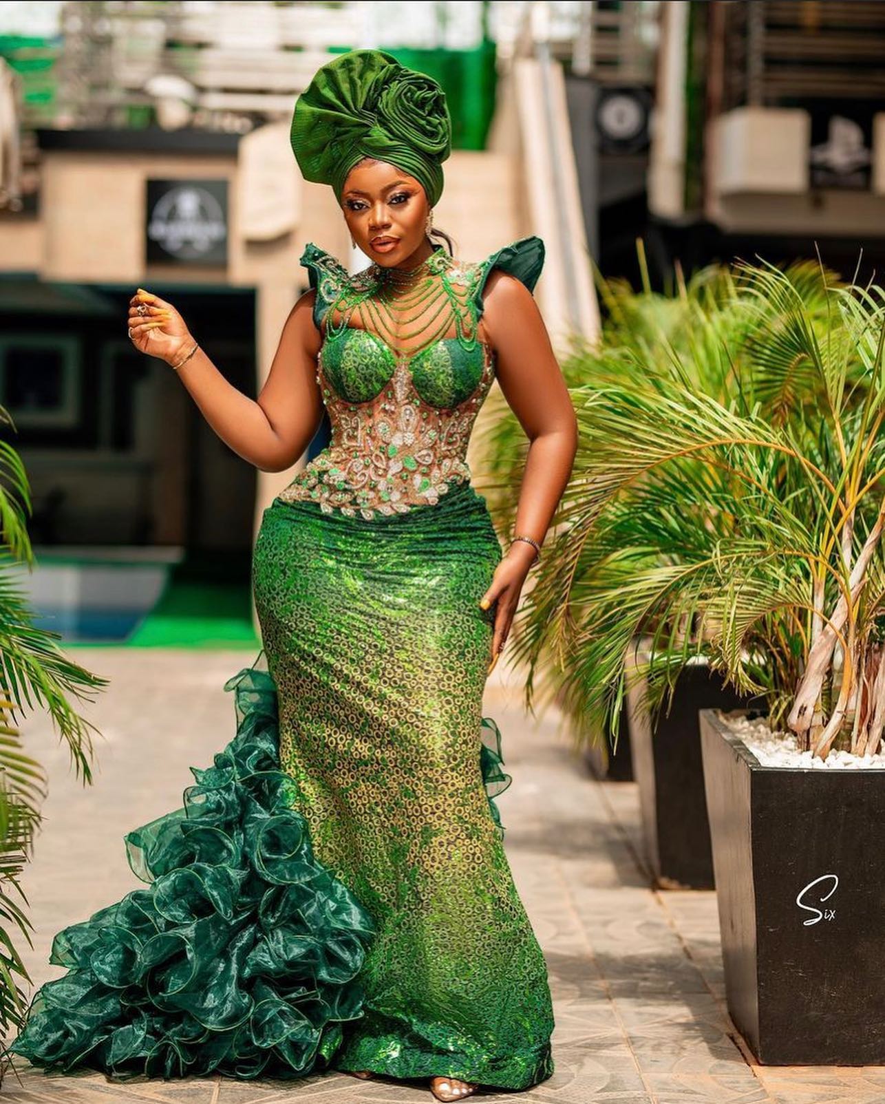 6. Jade Statement: Make a bold statement with a stunning jade green asoebi outfit. Whether it’s a voluminous ball gown, a dramatic cape dress, or a fitted midi dress, the deep green hue will ensure all eyes are on you. Opt for metallic accents and glamorous accessories to enhance the overall look.