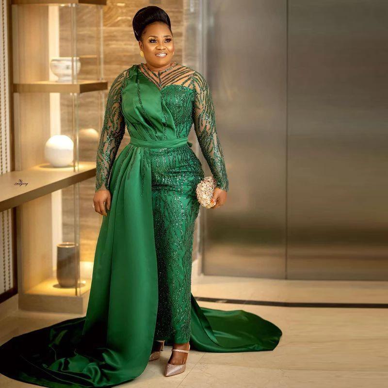 1. Emerald Elegance: Choose a regal emerald green asoebi outfit to radiate power and sophistication. Opt for a floor-length gown with intricate embroidery or embellishments, paired with statement jewelry and a sleek updo.