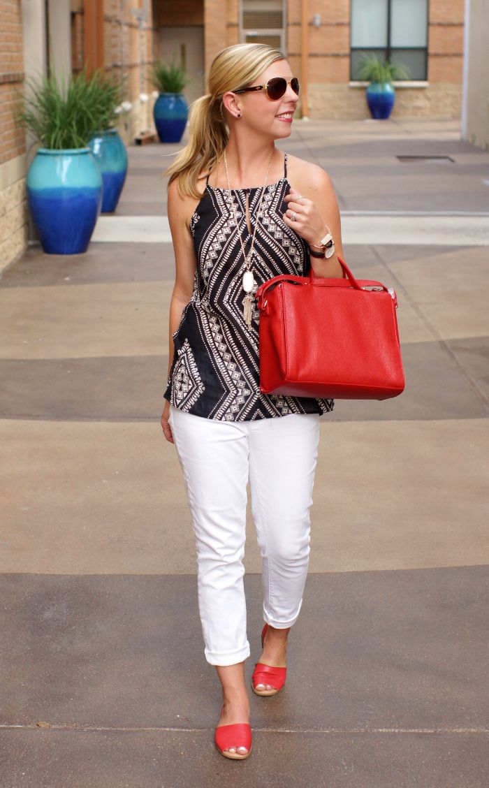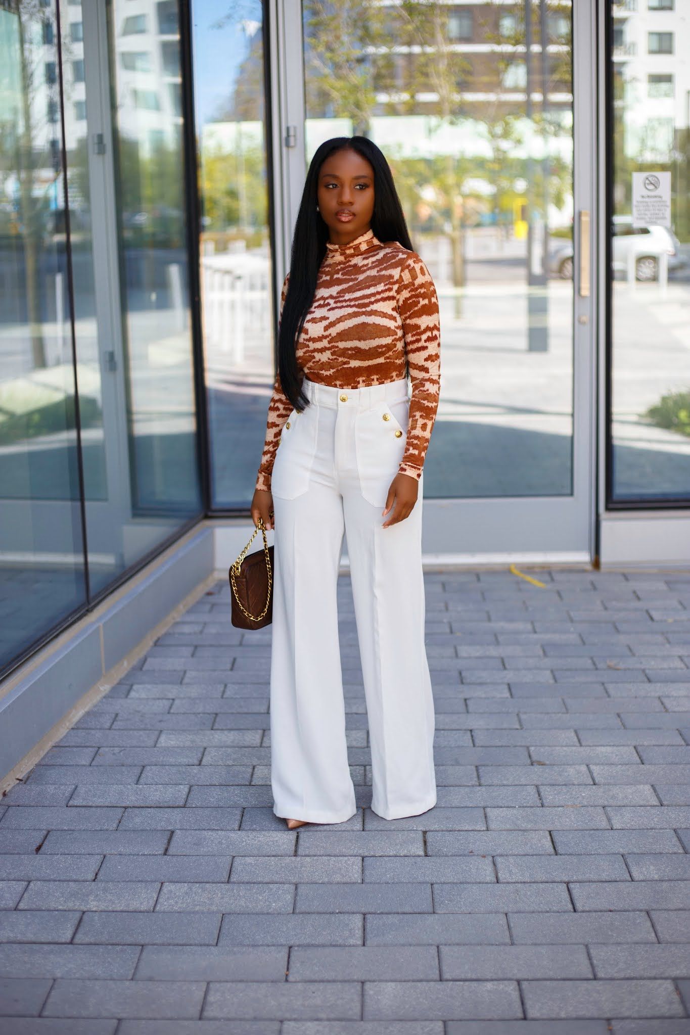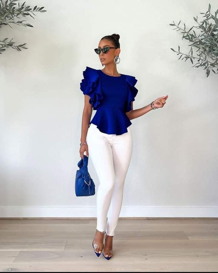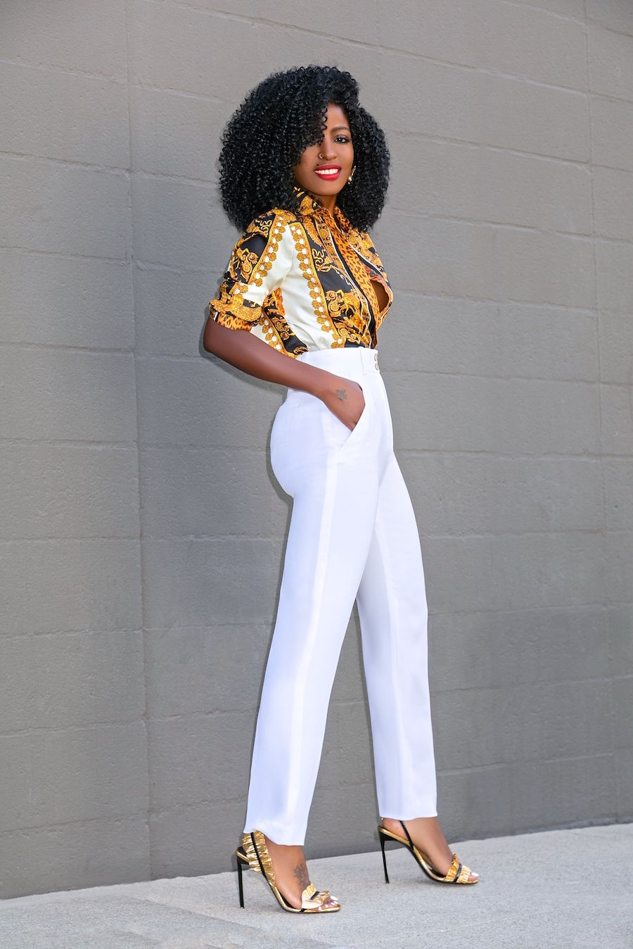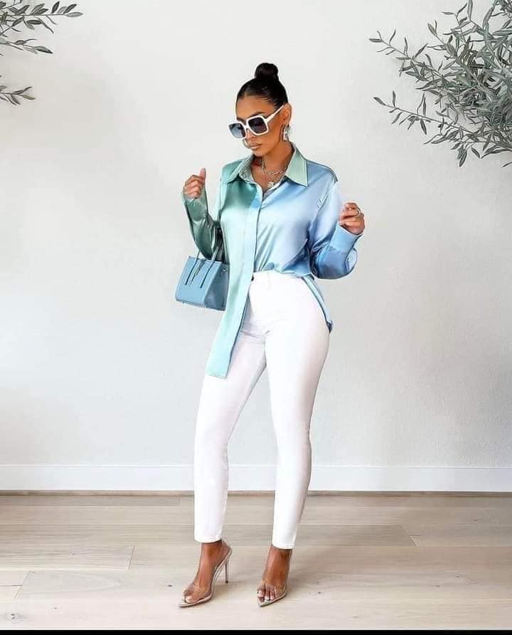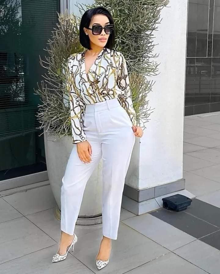 Infuse your white pants outfit with a burst of color by adding a vibrant blouse or a bold printed top. Opt for shades like cobalt blue, coral, or sunny yellow to create a striking contrast against the white pants.