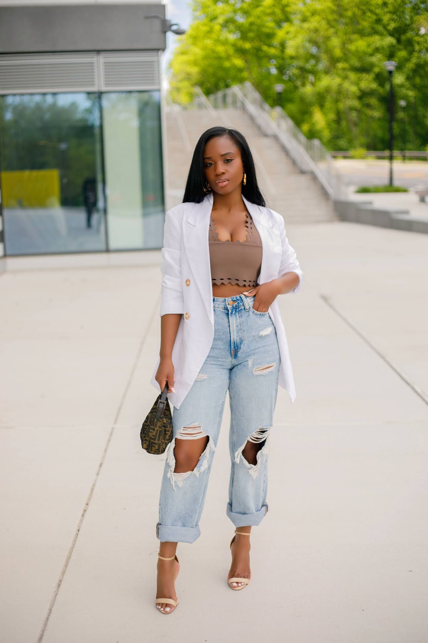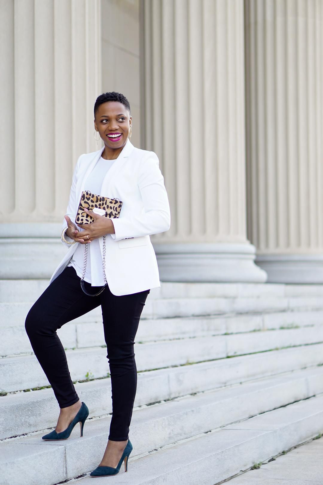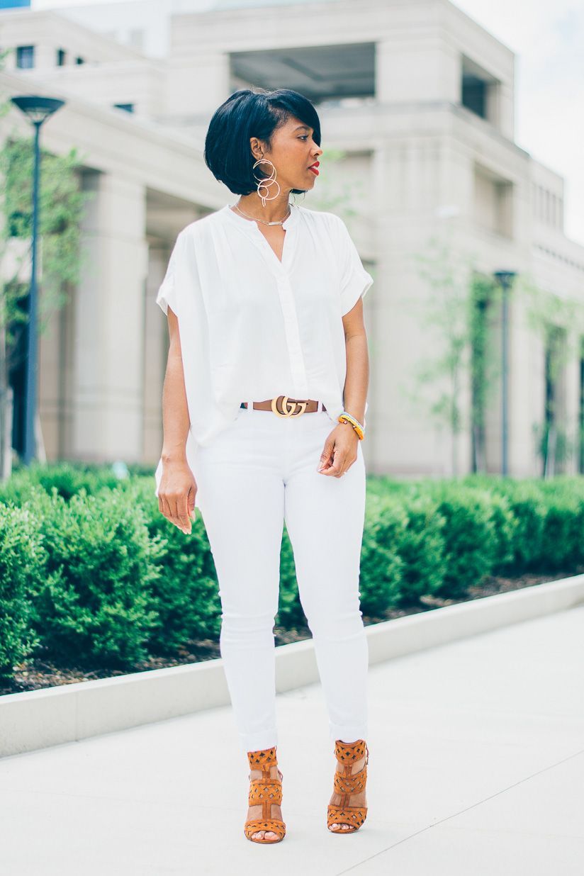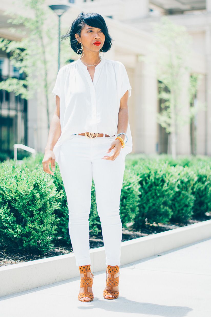For a more formal or office-appropriate look, pair your white pants with a tailored blazer and a tucked-in blouse. Choose a blazer in a complementary color or opt for a classic black or navy option. Finish the ensemble with pointed-toe heels for a sleek and professional aesthetic.