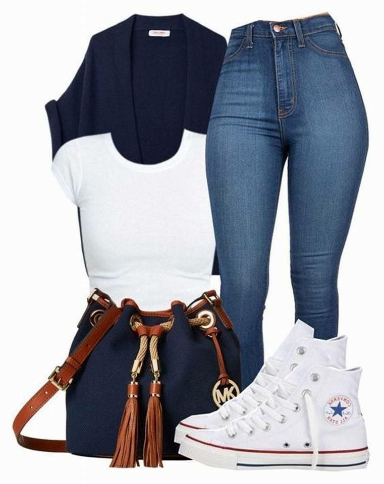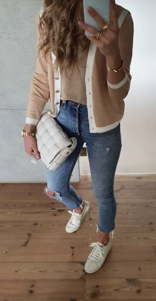 Create a retro-inspired look by pairing a fitted cardigan with flared jeans. Choose a cardigan in a solid color or a classic pattern like stripes and wear it buttoned up or open over a simple top. Tuck in the top for a more polished appearance and wear the flared jeans with heels to elongate the legs.