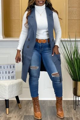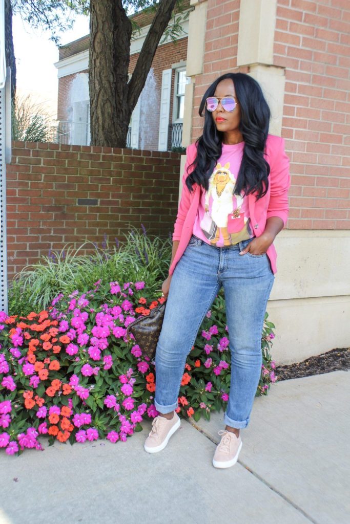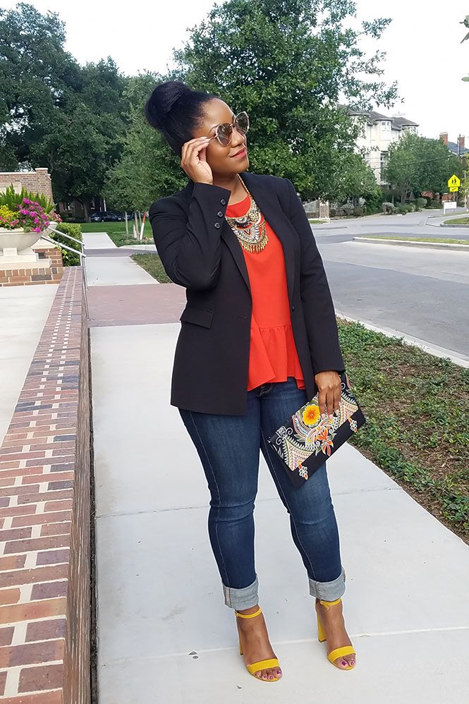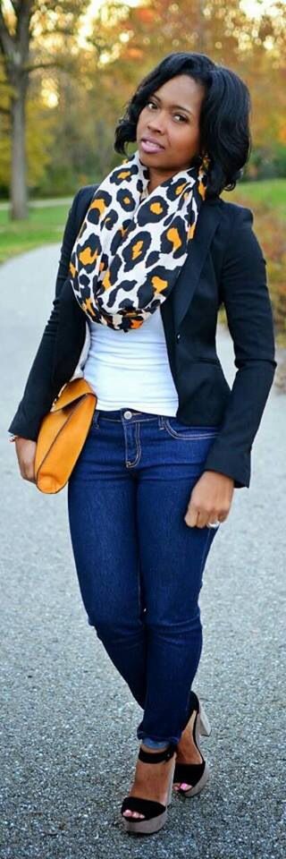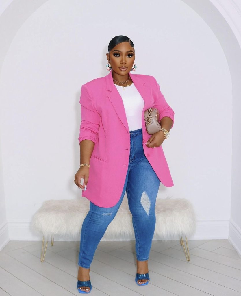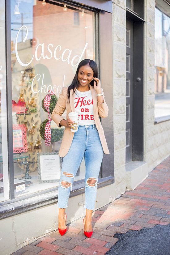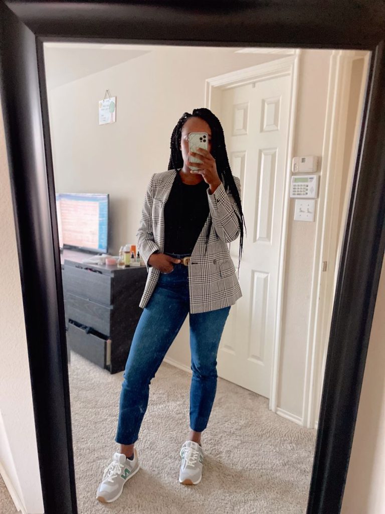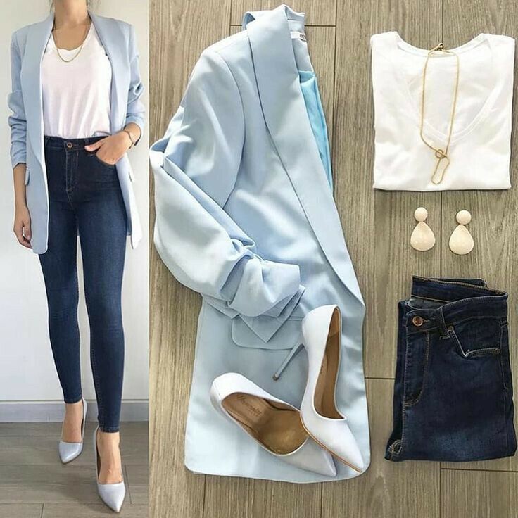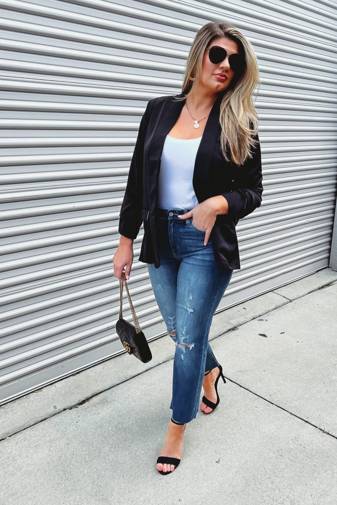 Pair a tailored blazer with dark-wash jeans for a polished yet relaxed look. Choose a structured blazer in a classic color like black, navy, or gray, and opt for a slim or straight-leg jean silhouette. Complete the outfit with a simple blouse or a tucked-in button-down shirt and finish with heels or loafers.