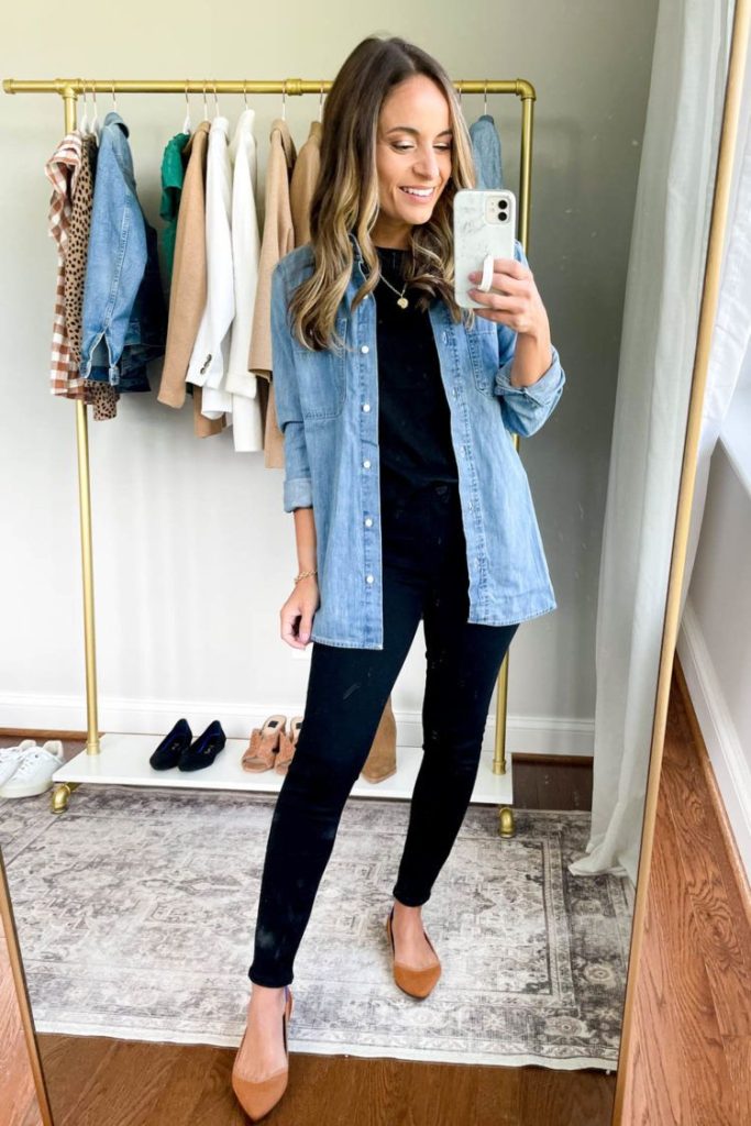 Wear a denim jacket over a shirt dress for a casual and trendy ensemble. Opt for a shirt dress in a professional fabric like cotton or linen, and layer a denim jacket over it. Add a belt to define your waist and finish the look with ankle boots or ballet flats.