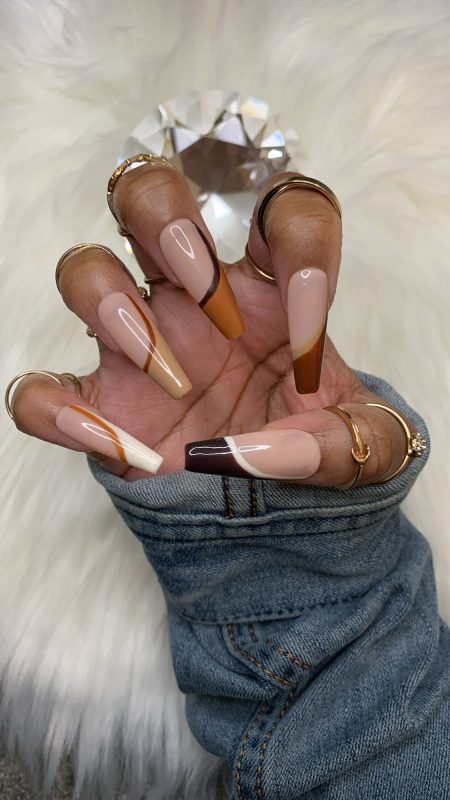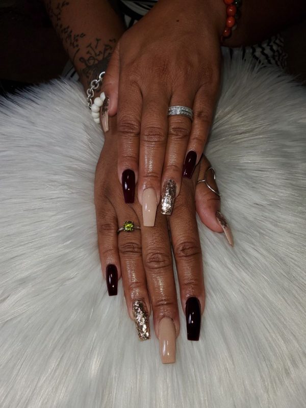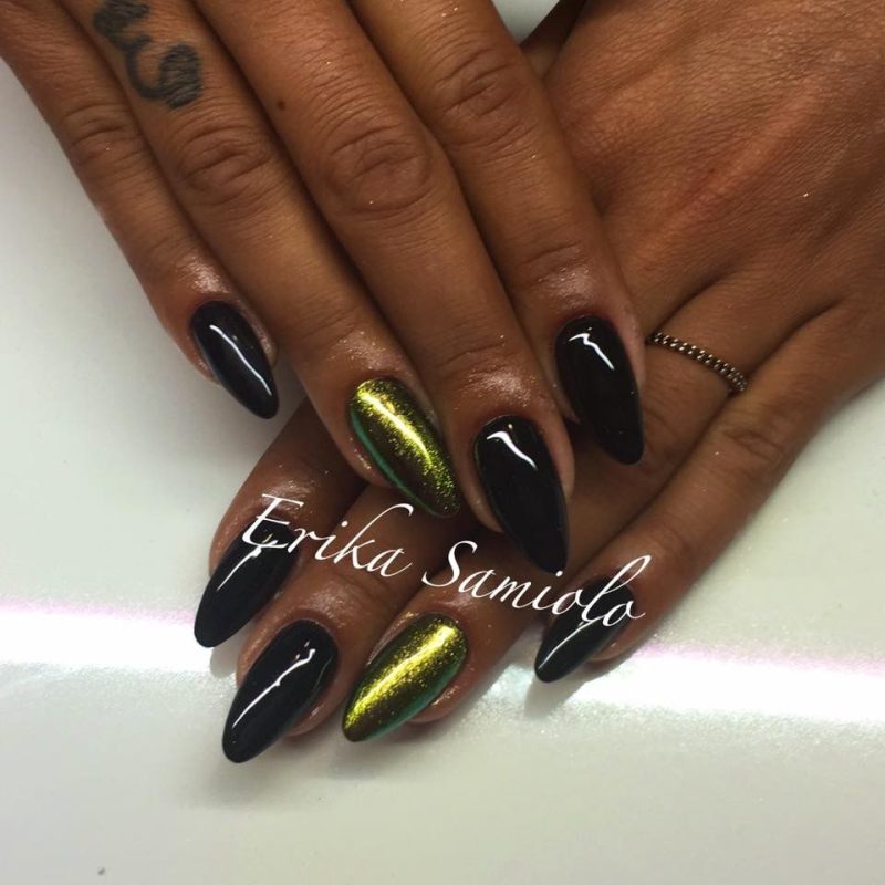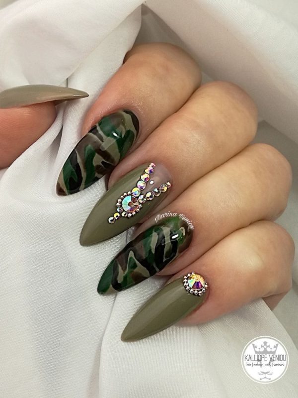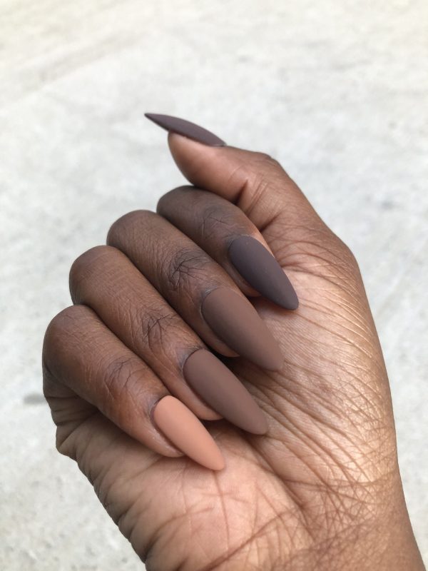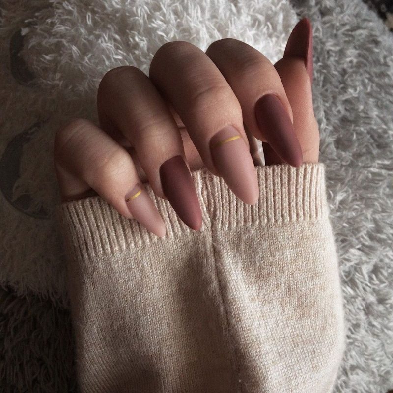 There are so many different ways of painting your nails. From glitter to matte nails that you can try. As autumn season is approaching why not incorporate colour of season to your nail look, like these nails below. Pick matte green mix with a nude base nail with glitter + white and black accents.