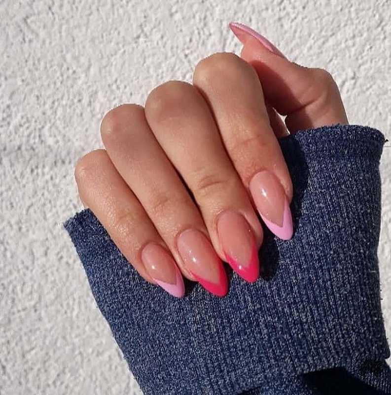 French oval manicure with a striped gradient in pink tones. Summer flower nail design close-up.