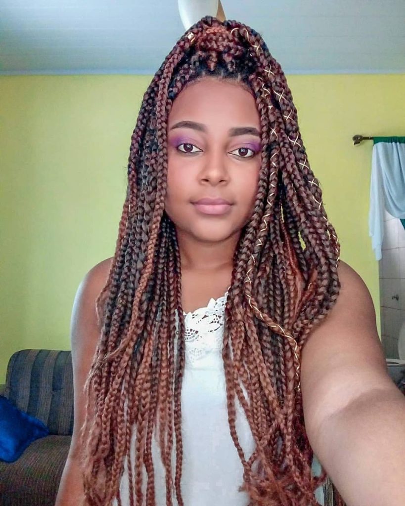 11. Box Braids with Metallic Threads: Introduce metallic threads into your box braids for a shimmering and opulent effect. These threads catch the light and give your braids a luxurious sheen.