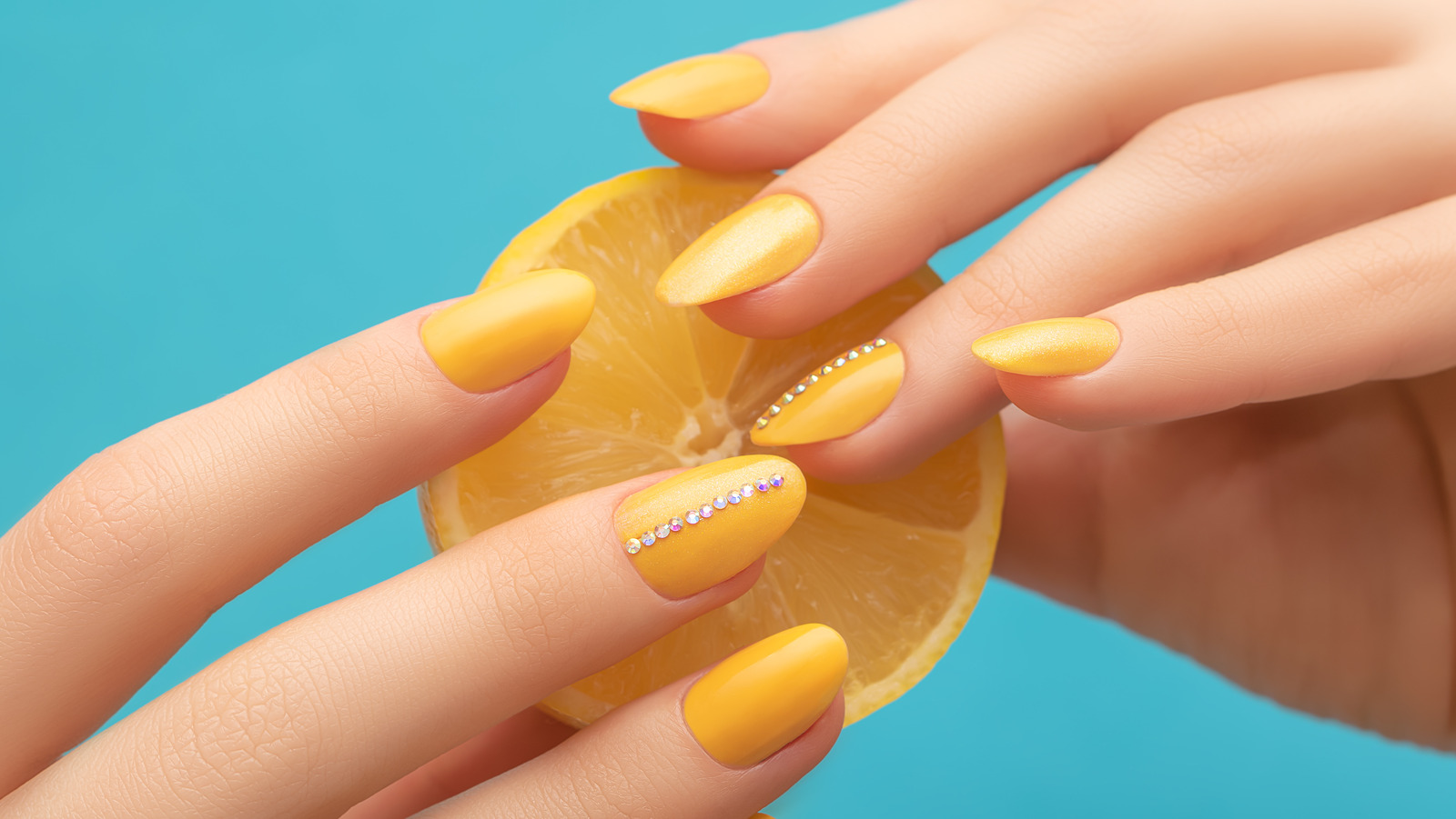 Female,Hands,With,Yellow,Nail,Design.,Yellow,Nail,Polish,Manicure.
