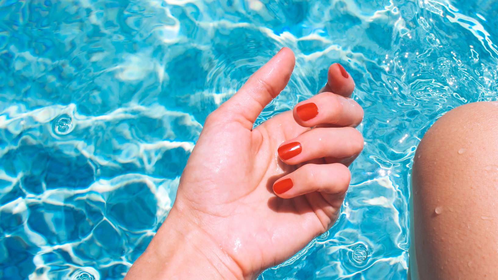 Woman’s Hand and Woman’s Knee in Swimming Pool, Red Nail Polish on Fingernails