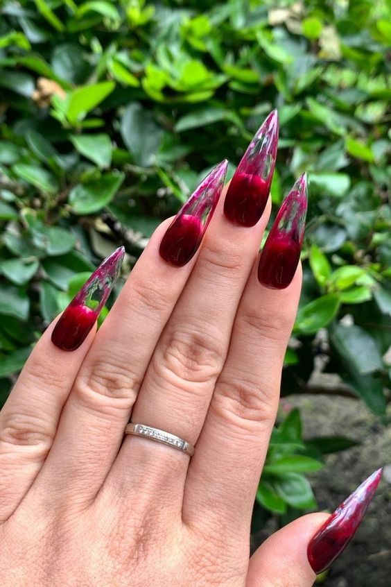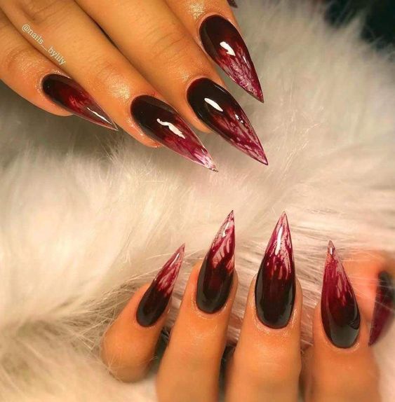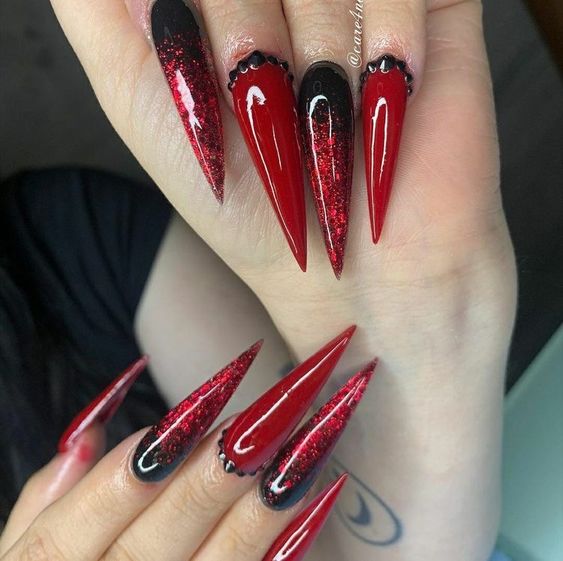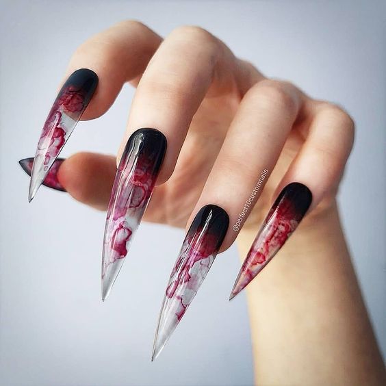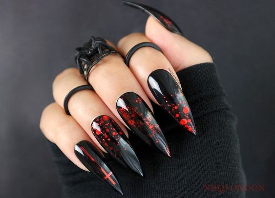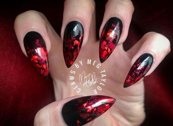 - Bloody Tips: French manicure style with red tips on a black base.