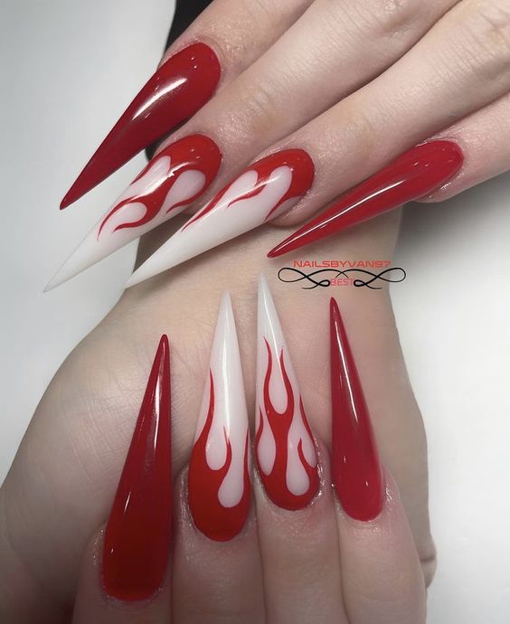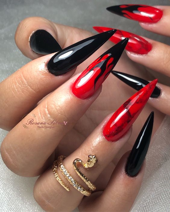 - Feisty Flames: Black nails with fiery red flame patterns.