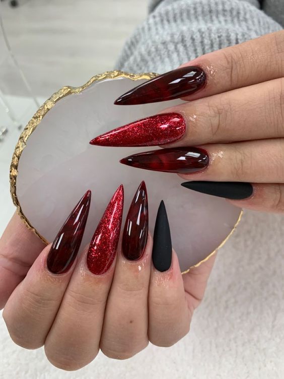 - Dual Matte: Half the nail matte red, the other half matte black.
