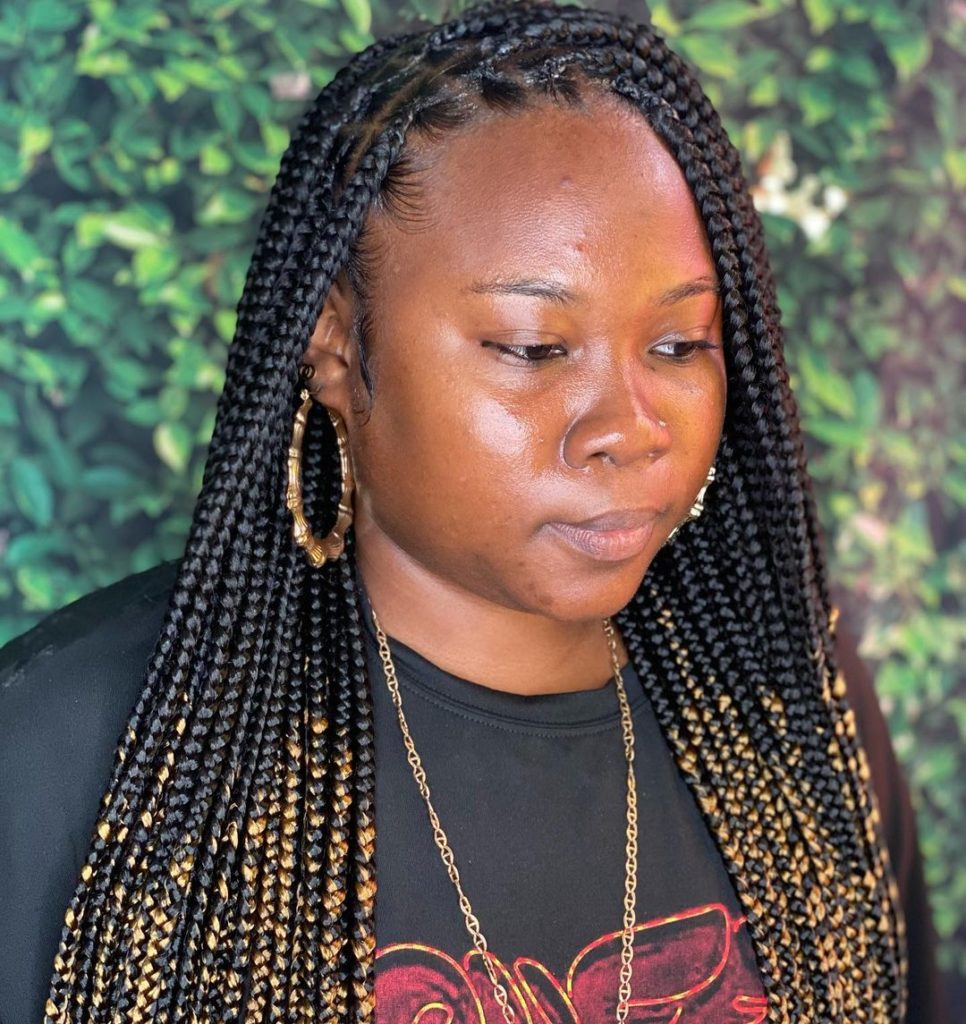 Radiate warmth with honey blonde knotless braids that add a sun-kissed glow to your overall appearance. This versatile shade complements various skin tones and outfits.
