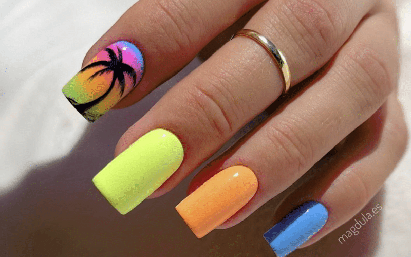 Embrace the tropical vibes with vibrant nail colors and patterns. Think palm trees, exotic flowers, and fruity accents. Go for bold shades of green, blue, coral, and yellow to capture the essence of a tropical paradise.