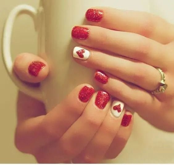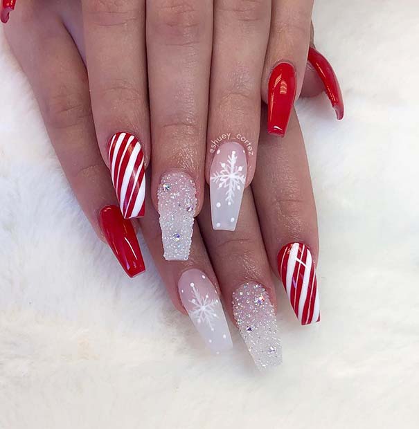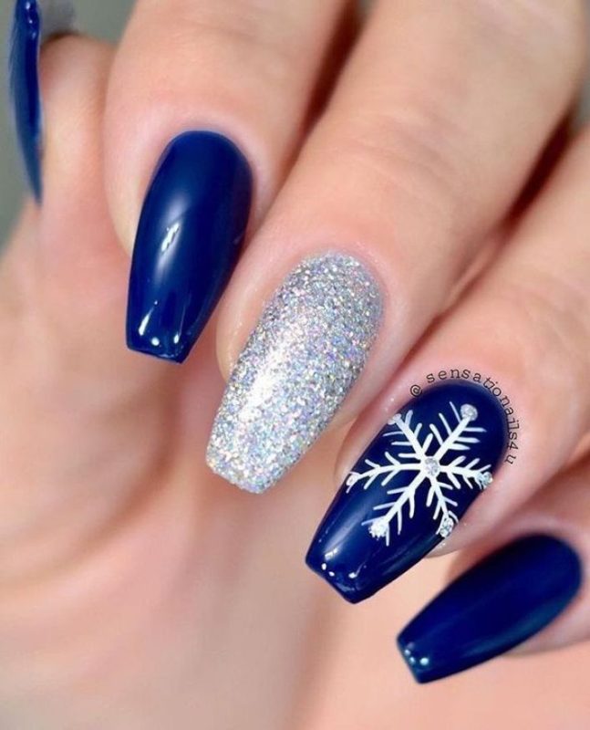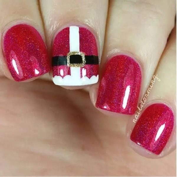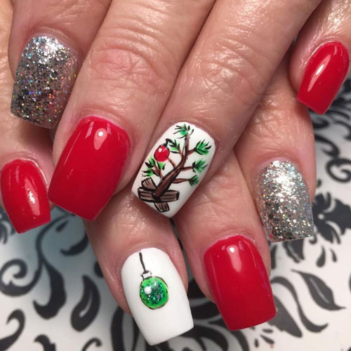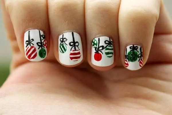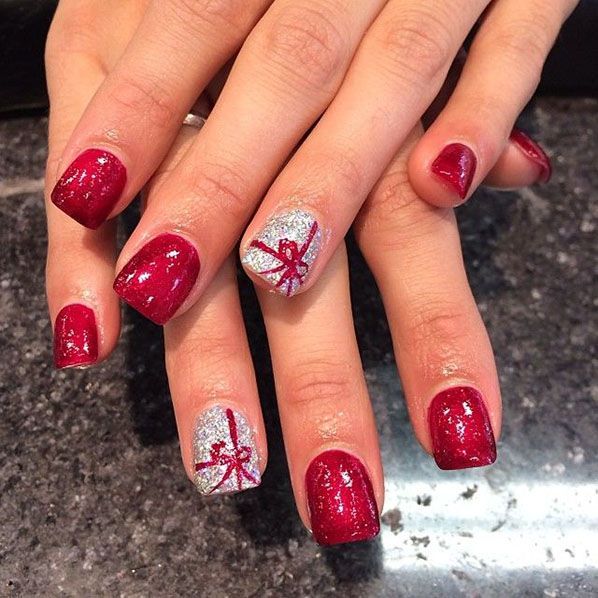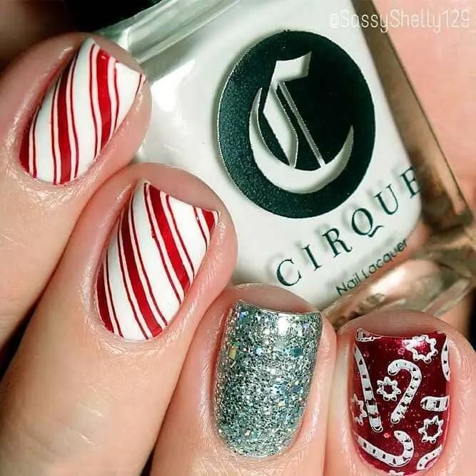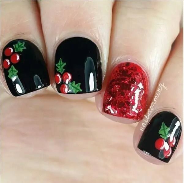 Many of the designs take advantage of the deep shimmer of glitter nail polish. Glitter reflects the light and makes the designs extra festive. Sometimes glitter serves as the background of a nail design, while in other designs, a plain glittered nail complements the pattern.