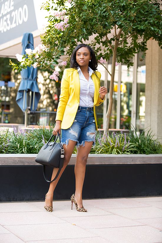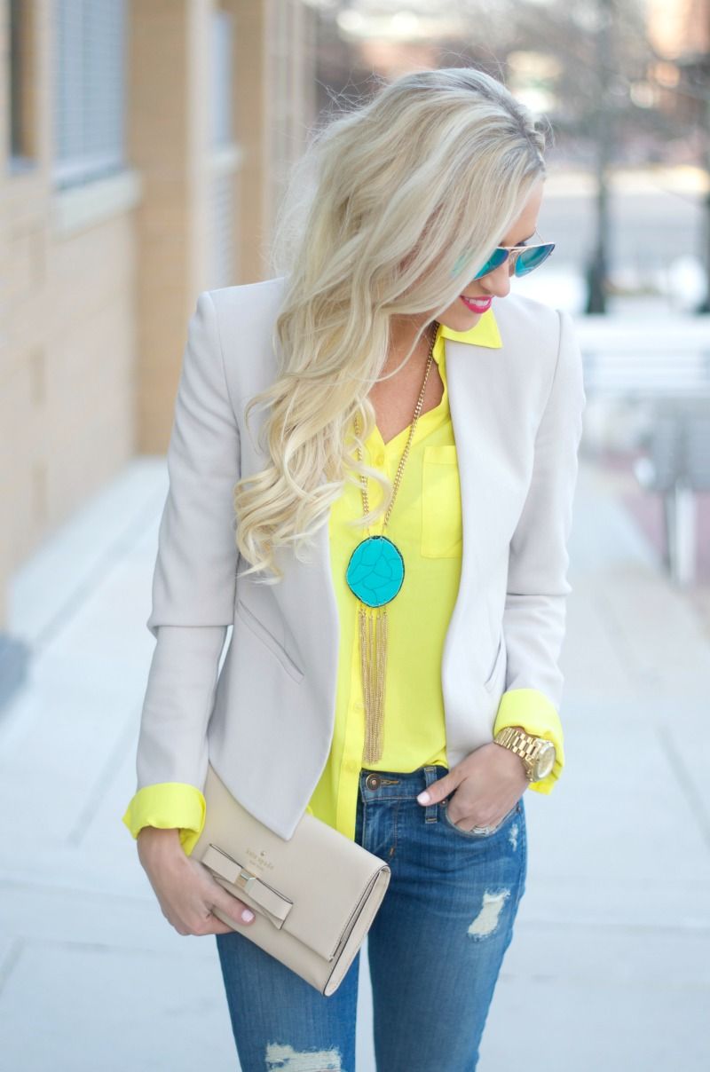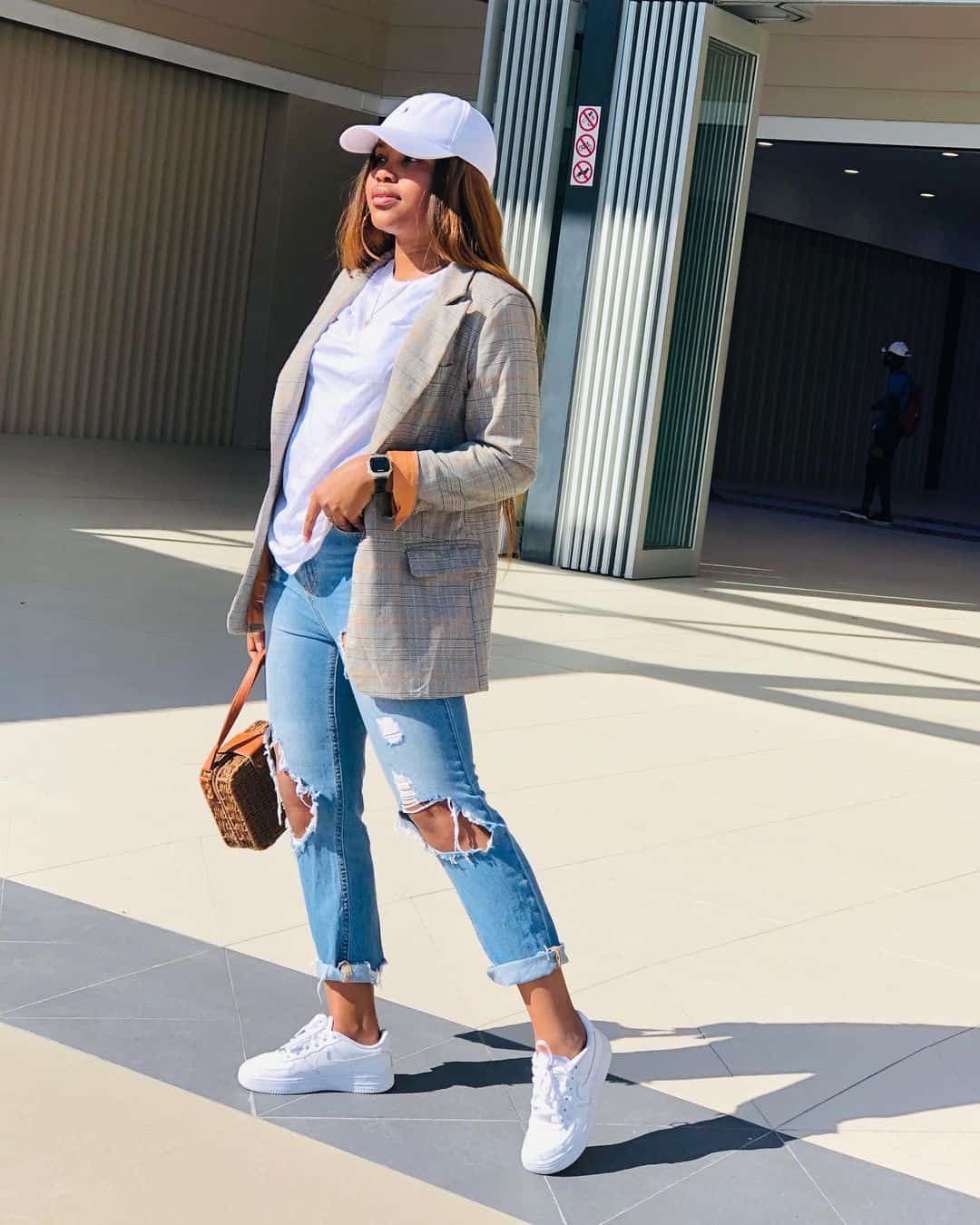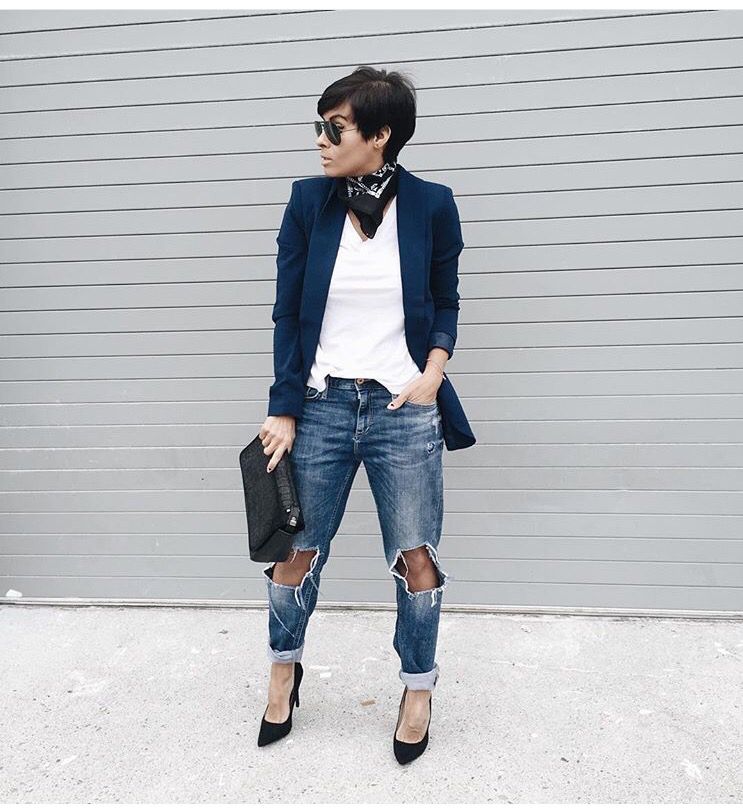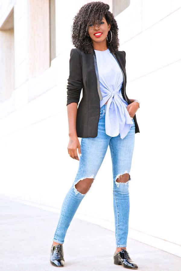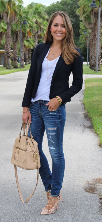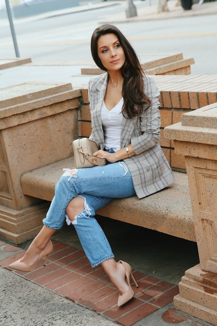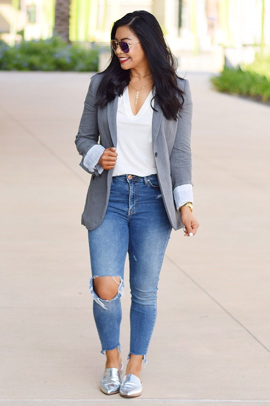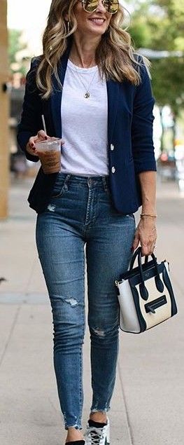 1. Casual Chic: Pair a fitted blazer in a neutral color, such as black, navy, or gray, with a pair of distressed jeans. Add a basic t-shirt or a striped top underneath the blazer for a relaxed yet chic look. Complete the outfit with sneakers or ankle boots for a casual vibe.
