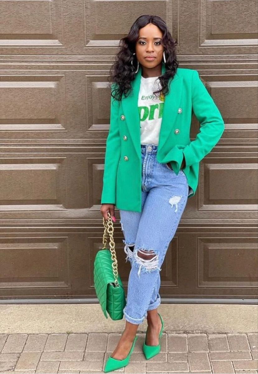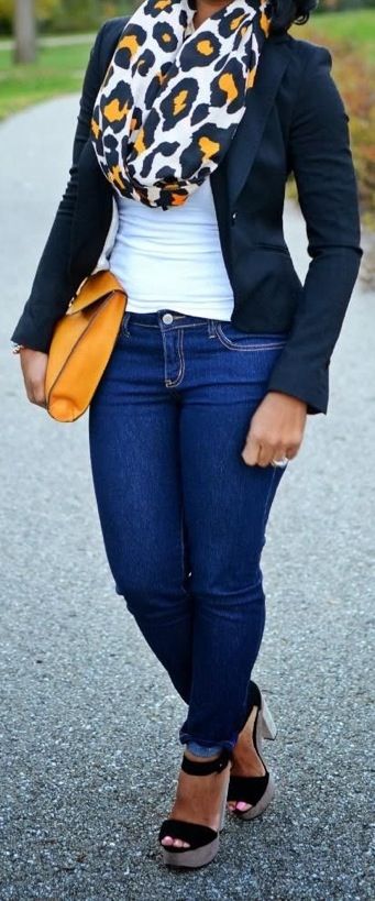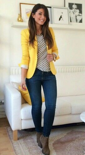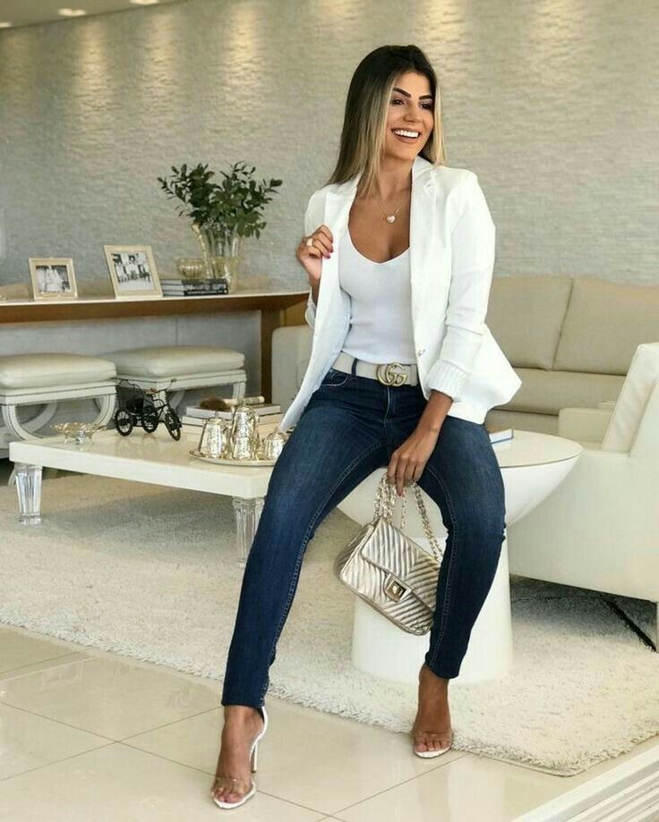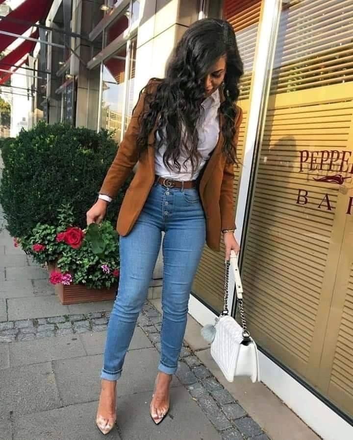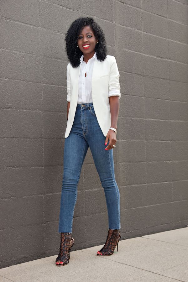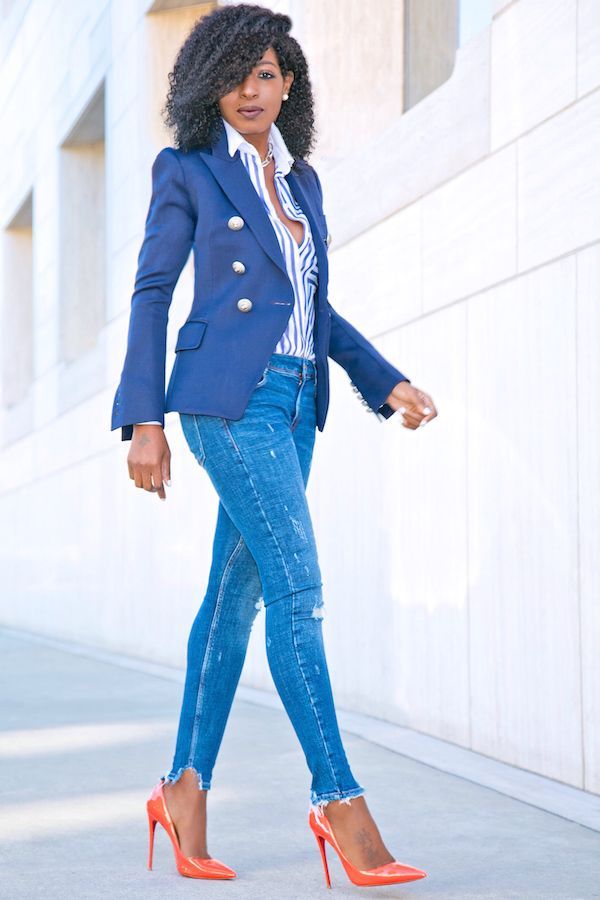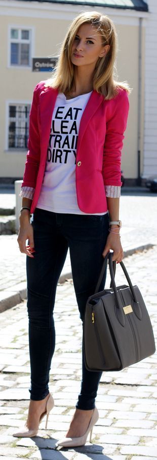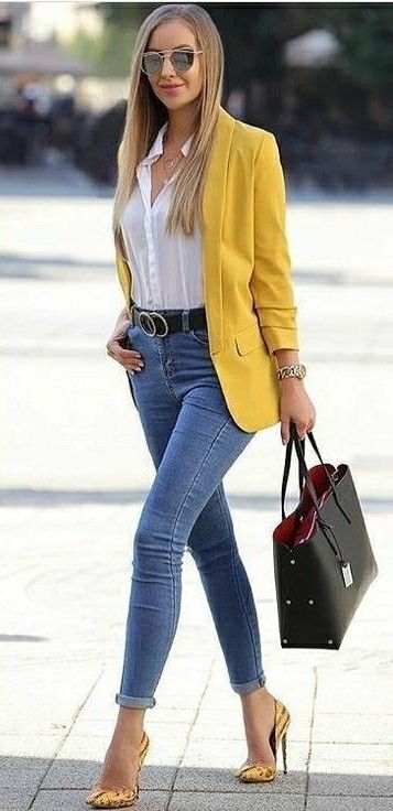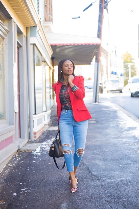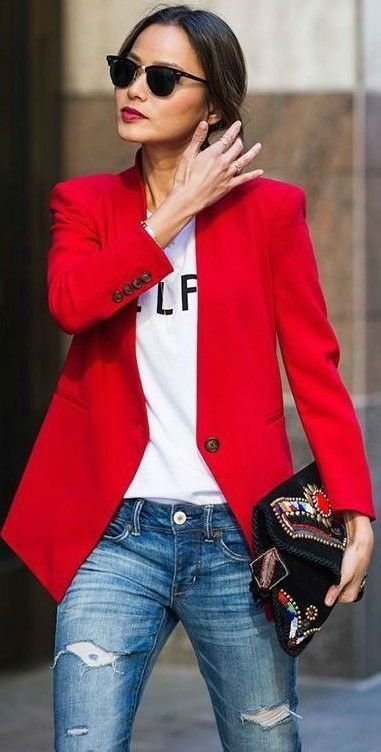 2. Sophisticated Office Look: Opt for a tailored blazer in a bold color, like red or cobalt blue, and pair it with dark wash or black jeans. Tuck in a crisp white button-down shirt and add pointed-toe heels for a polished and professional ensemble.