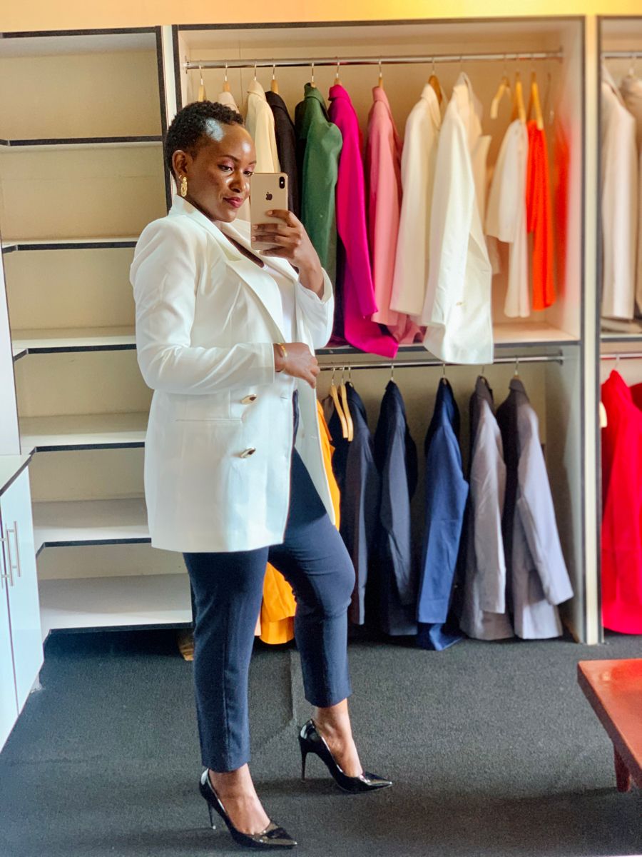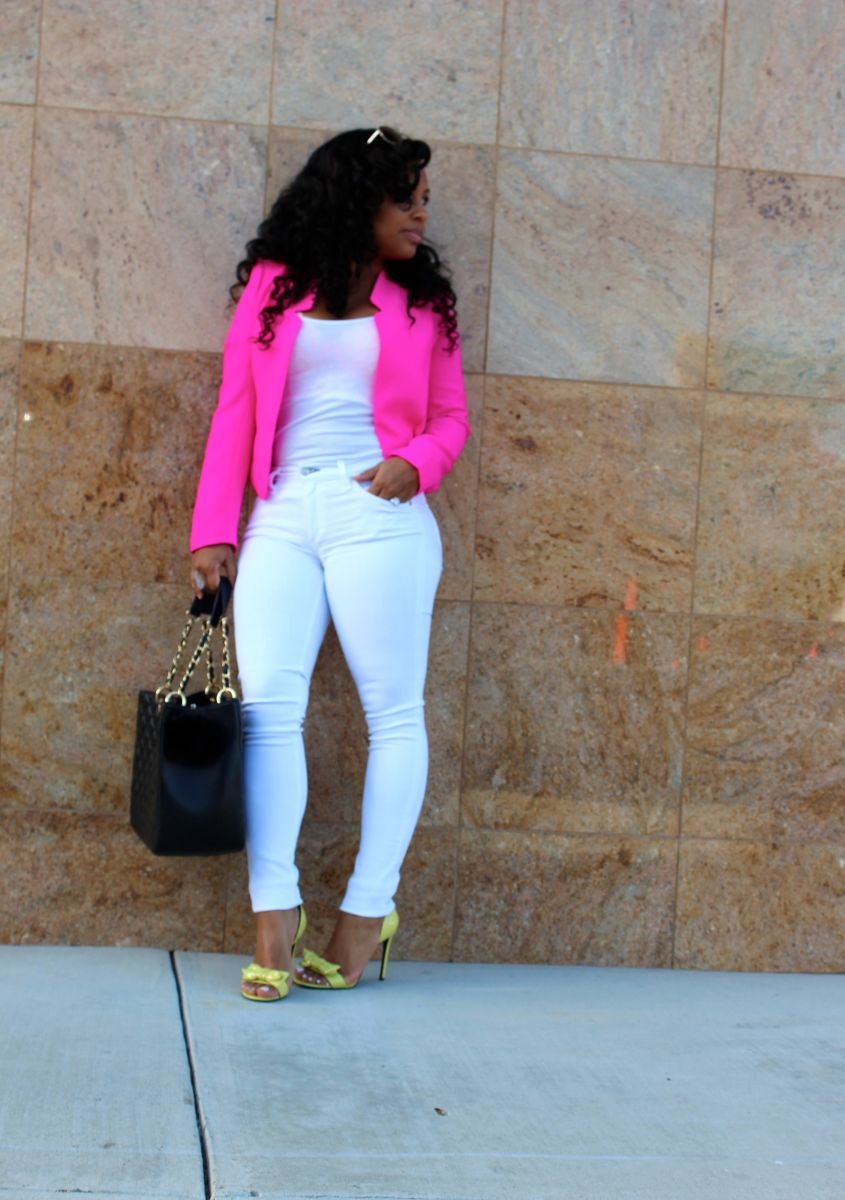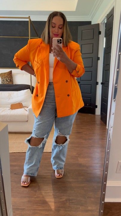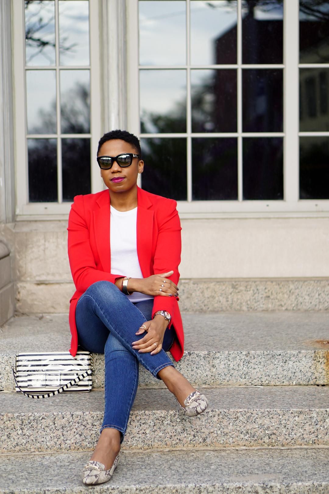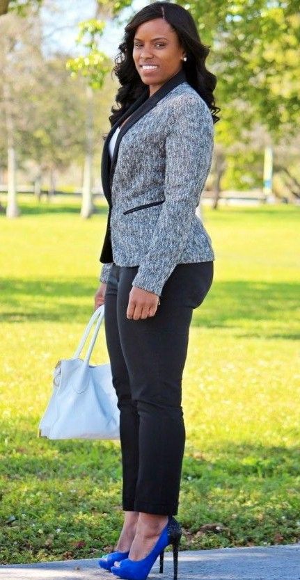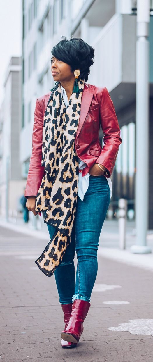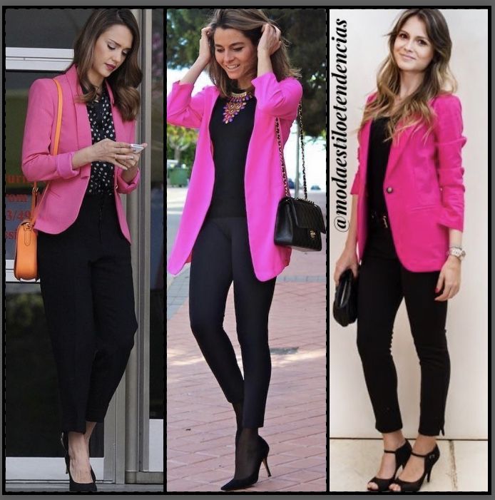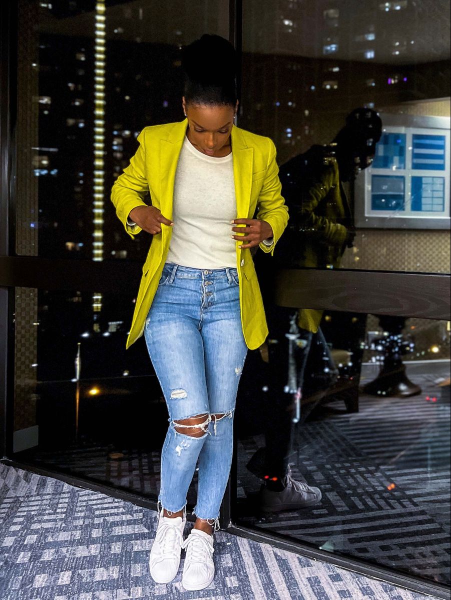 2. Sophisticated Office Look: Opt for a tailored blazer in a bold color, like red or cobalt blue, and pair it with dark wash or black jeans. Tuck in a crisp white button-down shirt and add pointed-toe heels for a polished and professional ensemble.