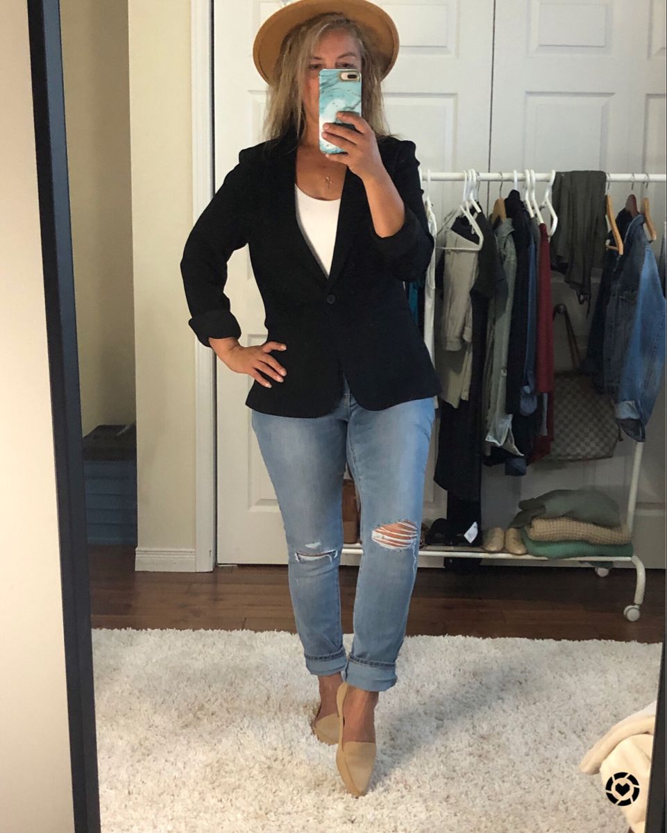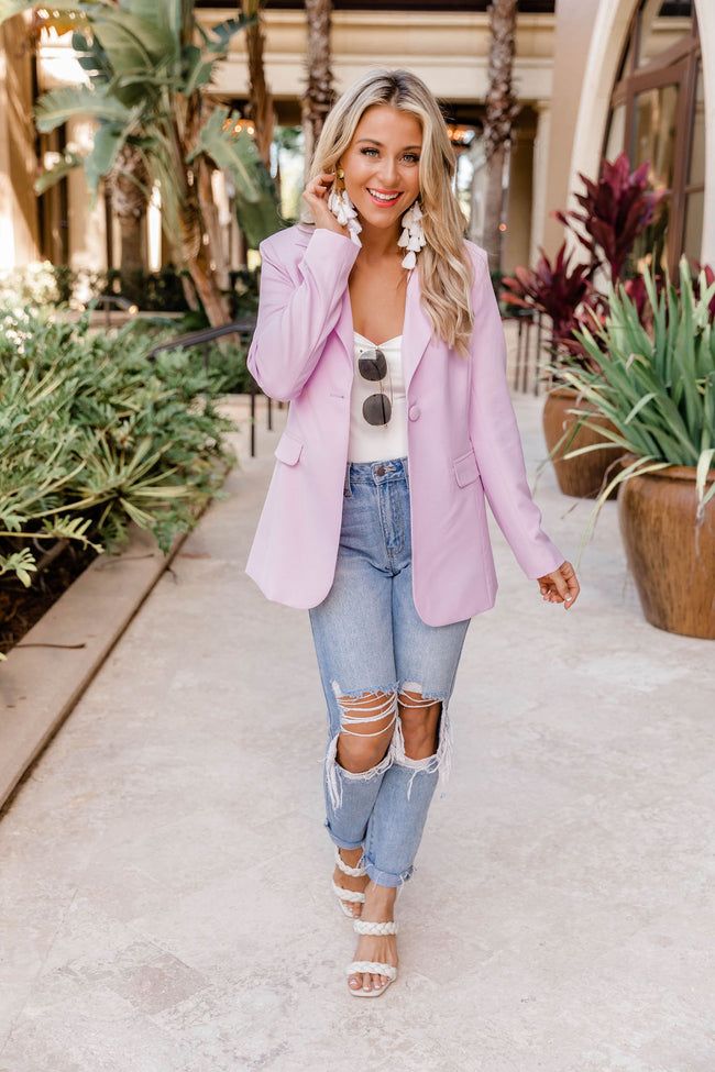5. Weekend Comfort: Opt for a loose and relaxed blazer in a lightweight fabric, like linen or chambray, and pair it with boyfriend or mom jeans. Layer a basic tank top or a casual blouse underneath and complete the outfit with sandals or slip-on sneakers for a comfortable and easygoing weekend look.