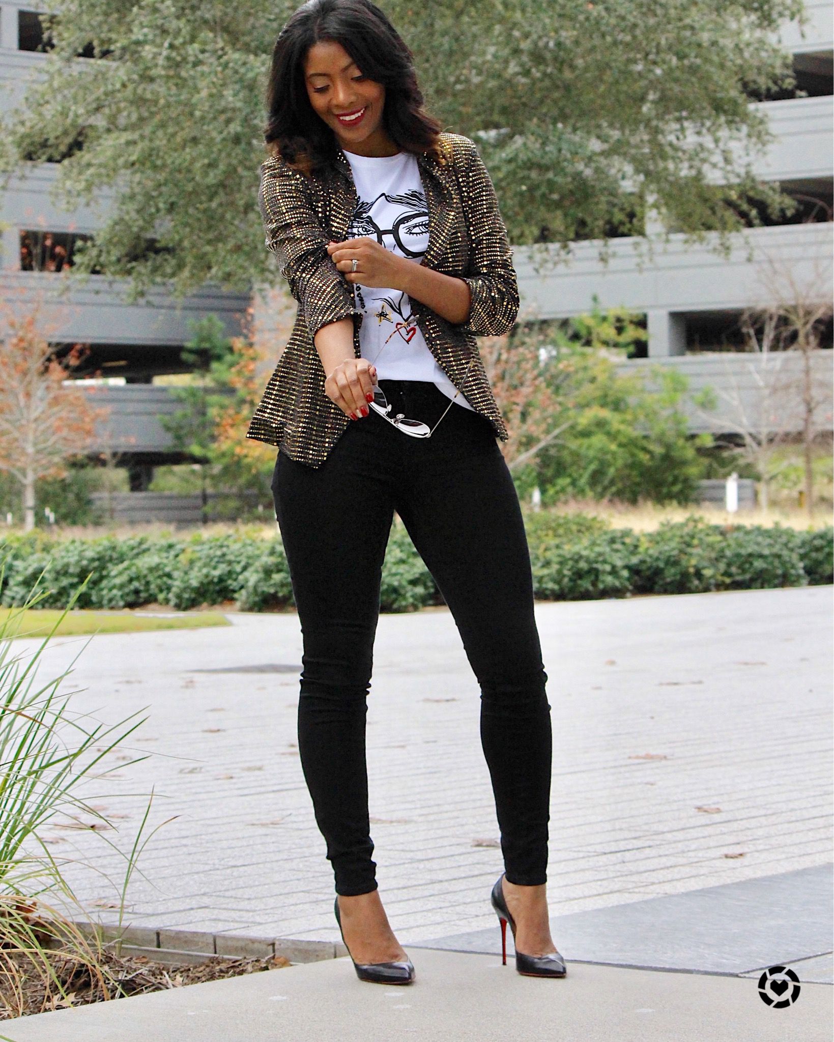 4. Date Night Glam: Select a sleek and tailored blazer in a metallic or sequined fabric and wear it with black skinny jeans. Pair it with a silky camisole or a lace top for a touch of femininity. Finish off the look with heels and statement jewelry for a glamorous evening ensemble.