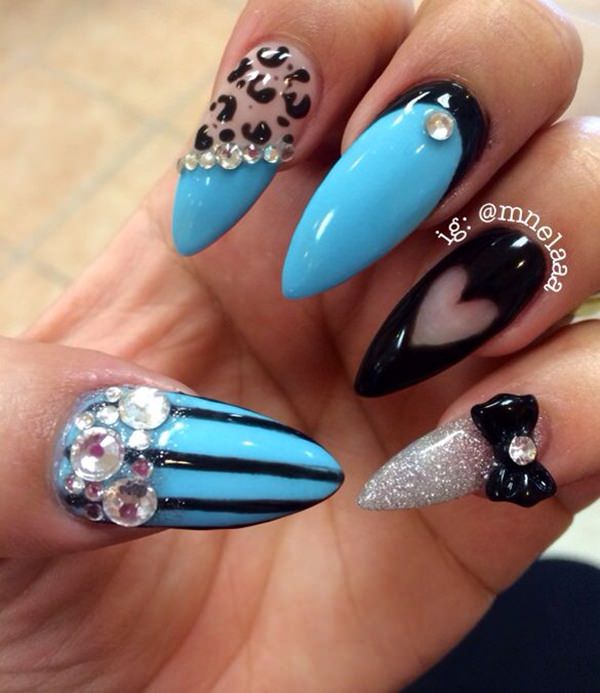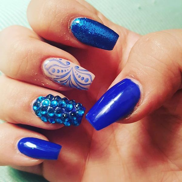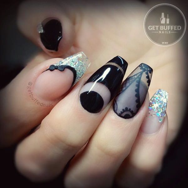 Combining midnight blue nails in the mix of patterned blacks is a rare design that many women would look lovely with. Try these out!