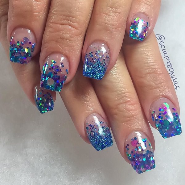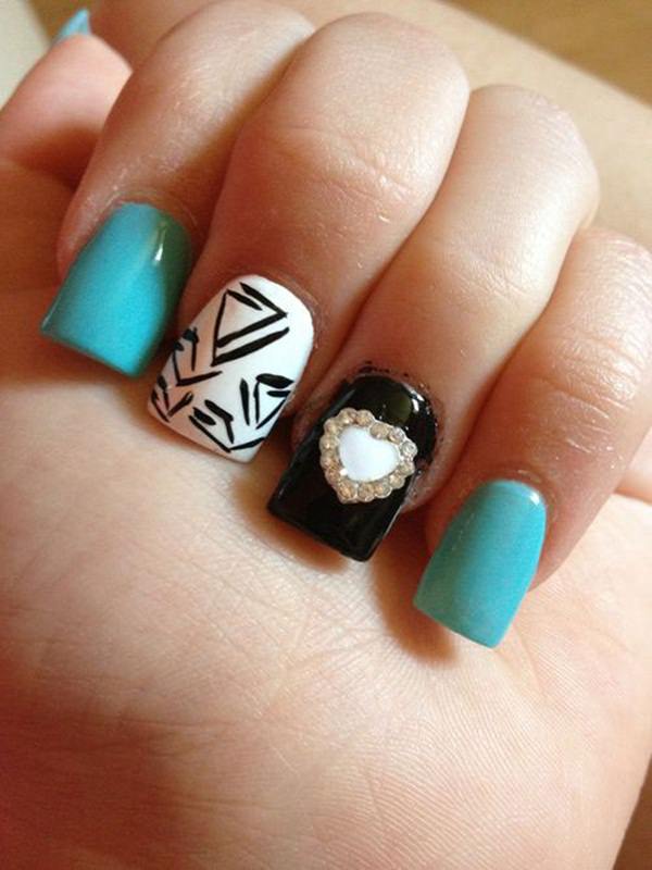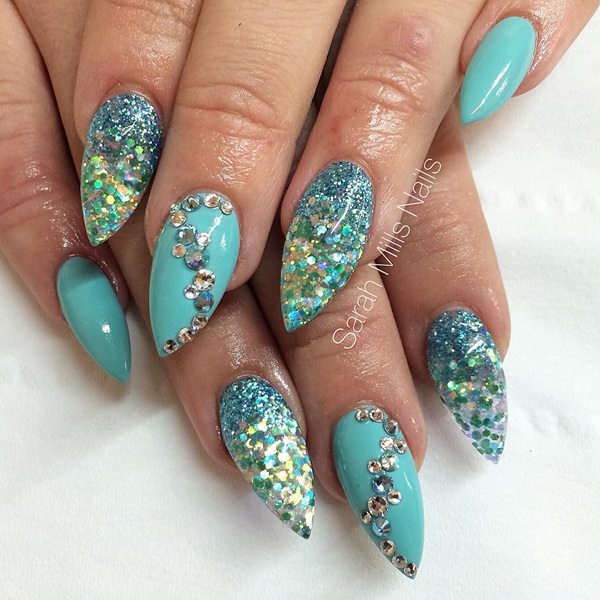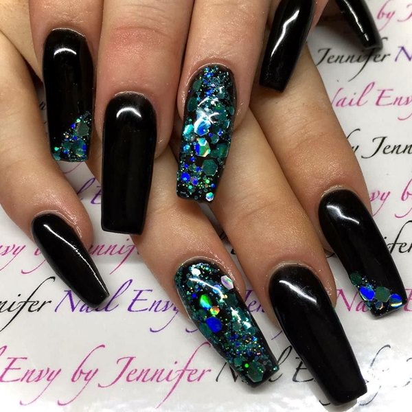 We’re in love with these glamorous nails, with teal and blue sparkles that shimmer in the light. They truly stand out when painted atop black.