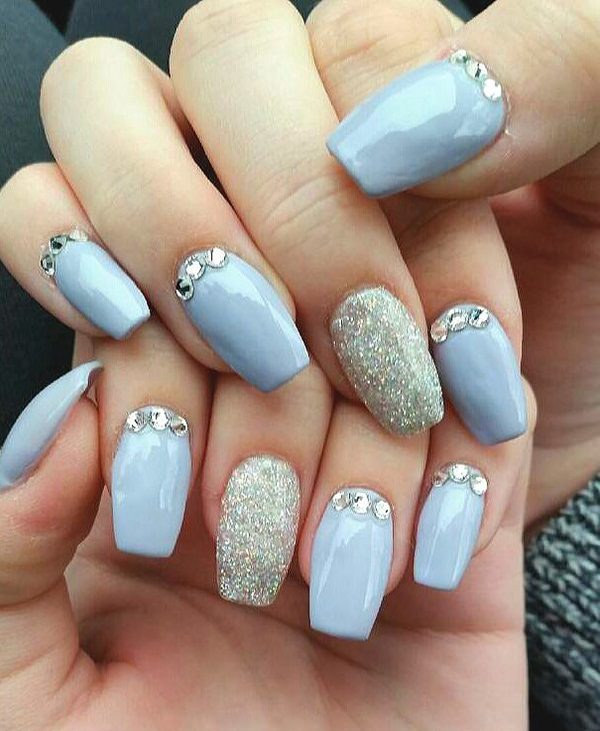 Baby blue is already a lovely yet rare color seen on manicures. Add dazzle with one or two nails on each hand done in matching sparkles, or add a few gems to have them catch the light.