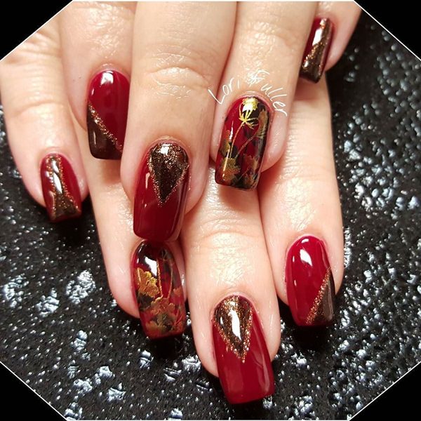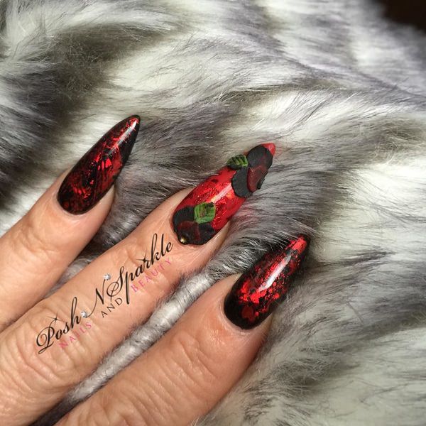 If you look closely, the red and black polishes collide to make a marble-effect on your nails. The Petals and leaves added make for a lovely holiday design.