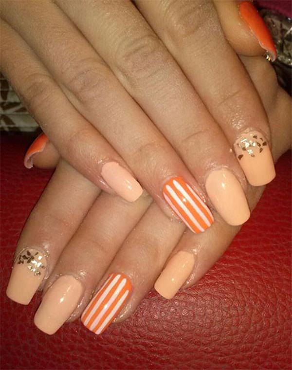 Not very many women think of oranges and peaches done with white when creating their acrylic nail design. But this is a marvelous example of what you can do with uncommon colors.