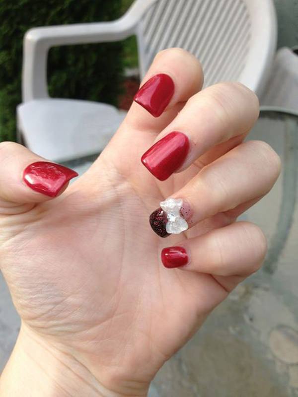 Red nails are sexy and alluring, so if you’re a fan of this type of nail, try adding a bit of dimension to the design with a bow or some sparkle to a nail or two.
