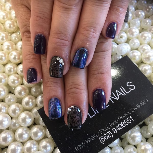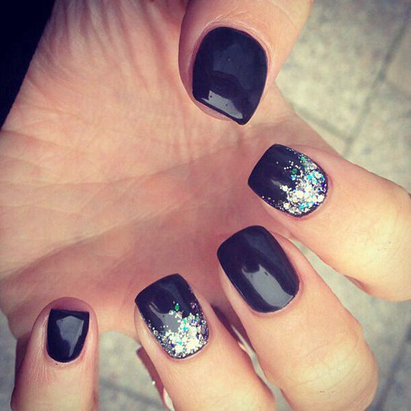 Another wonderful example of dazzling up some classic black nails by adding some silver and blue sparkle near the cuticles of just a few nails.