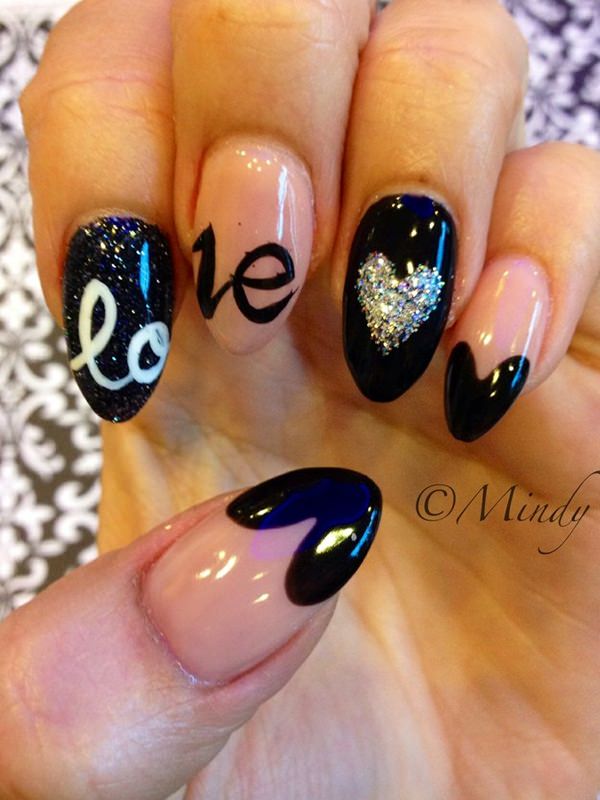 Who loves love? This gal does. She’s even tipped her thumb and pinkie nails to look like a hearts along with actually painting the word “love” on her fingers. Experiment with different words, just make sure they aren’t too long!